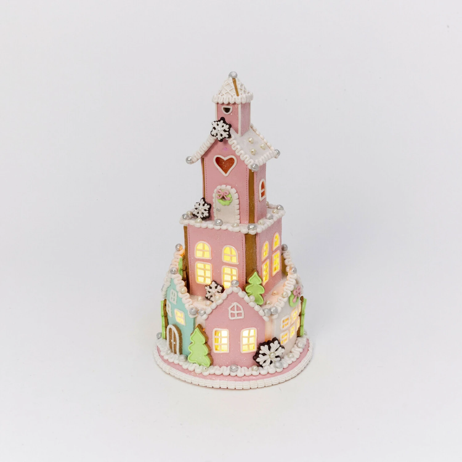 Stun your guests with this amazing gingerbread house! It features a 3 tiered cookie extravaganza! Each tier features decorated cookies and white pearl candies. The bottom is flat cookies against a cake base, the second tier is a pink house with tons of icing trimmed windows, and the top tier is a pink house with a white door, white icing and a tiny tower on top! The wonderful pastel pink, blue and greens really make this unique. Battery operated, requires 3 AA batteries, not included. Made of claydough. Dimensions: 8.2″ x 8.2″ x 13.5″. Item #: 2549820