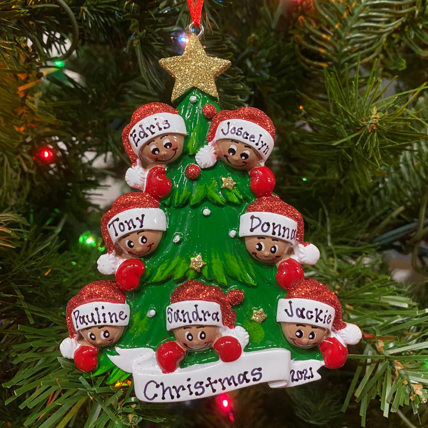 Honor your family with this adorable Christmas ornament! It features 7 smiling faces all wearing hats to get their name written on and a banner at the bottom with space for the family last name! Made of resin. Item #: AA827-7