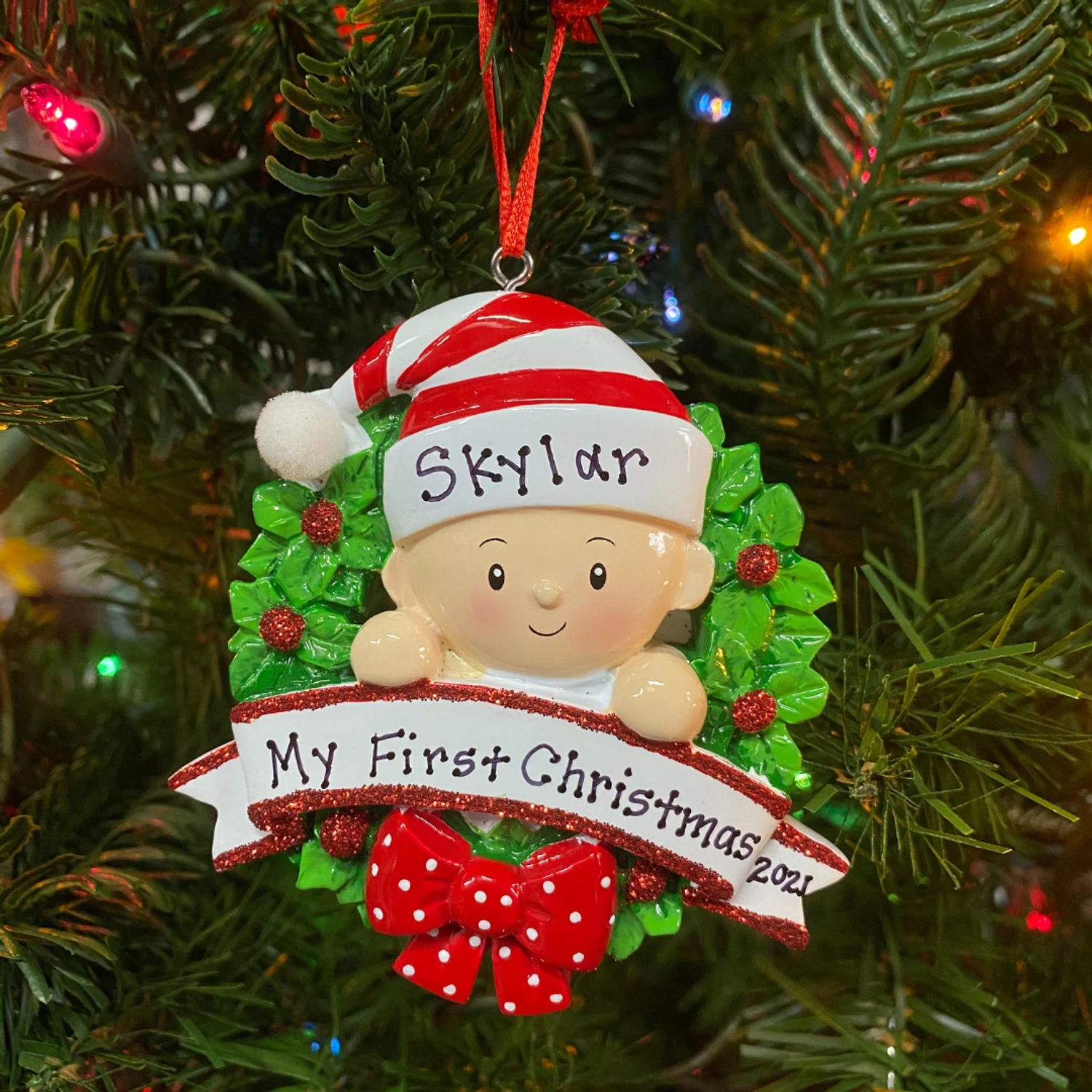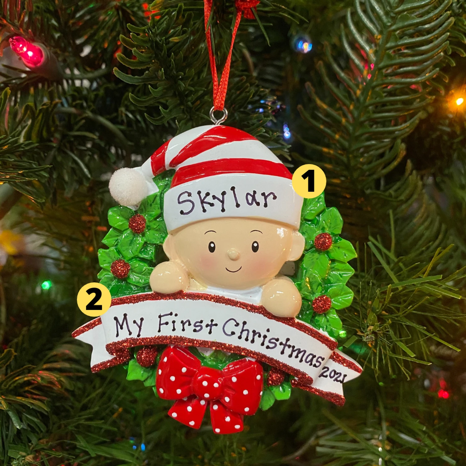There’s a new family member in town! Get an ornament to represent their first Christmas! This ornament features a green holy leaf wreath with sparkly red berries and a red polka dotted bow! A smiling baby pops out of the middle wearing a hat with space to write their name on and a banner beneath them to write their birthday! Made of resin. Dimensions: 3.25″ x 3″. Item #: OR1746-RGÂ