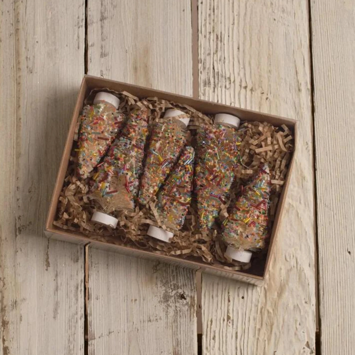 Sprinkles make everything better, brighter, and SWEETER! This set features ivory bottle brush trees covered in stunning rainbow sprinkles of all shapes and sizes! Sold as a set of 6. Packaged in a box. Made by Bethany Lowe. Made of bottle brush with bead mixture. Dimensions: 1.5″ x 1″ x 4″, 1.5″ x 1″ x 3″. Item #: LC1583