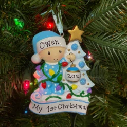 Baby Decorating A Tree Blue Personalized Christmas Ornament OR1847-B