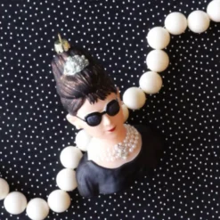 Are you a classic film lover?? Then we know you’ll love this ornament! It features Audrey Hepburn in her iconic black dress with matching black sunglasses and ornate necklace laying across her chest! Her hair is pinne4d up in her signature up-do and accented with a pearl tiara! Made by Cody Foster. Made of glass. Dimensions: 5.25″. Item #: GO-6732Â