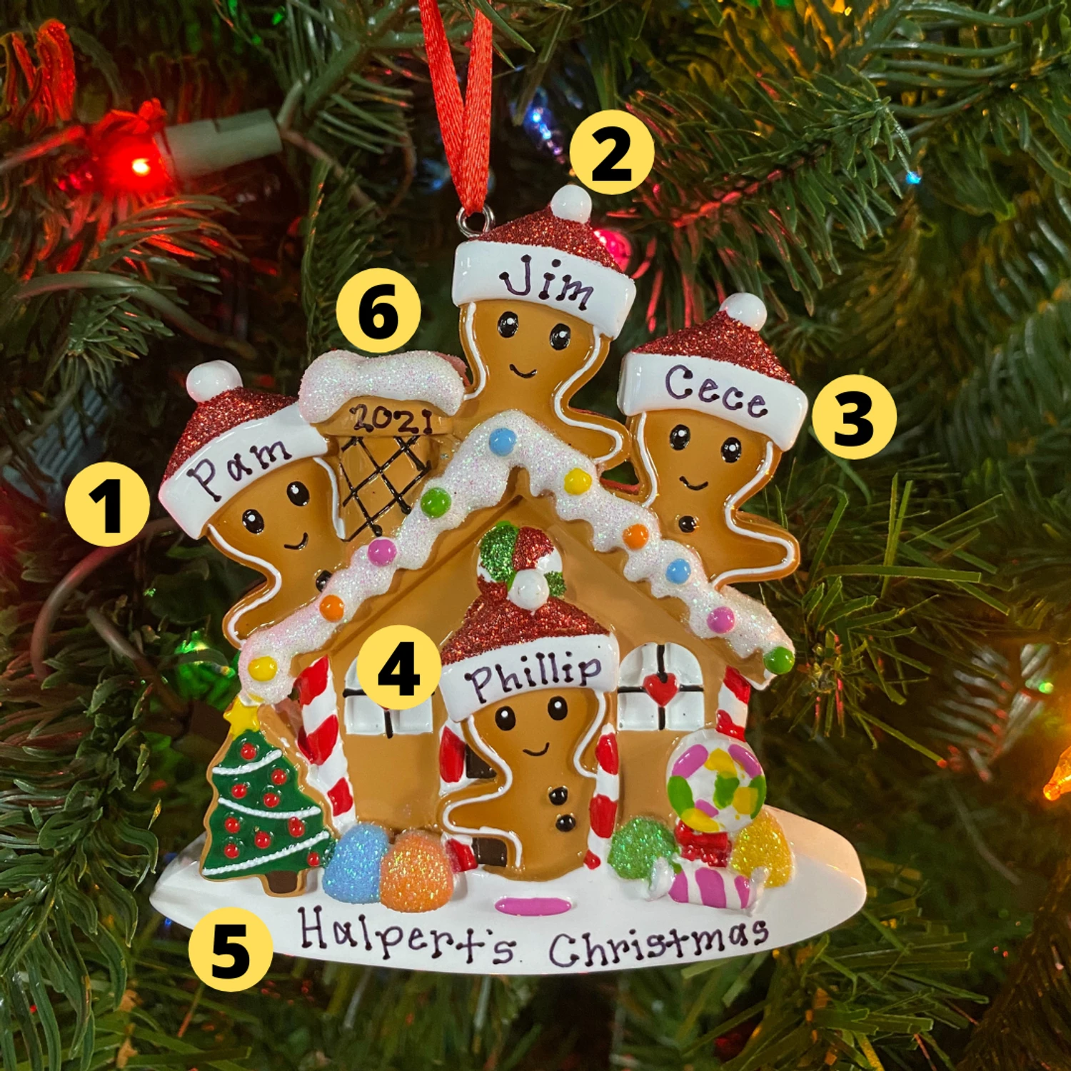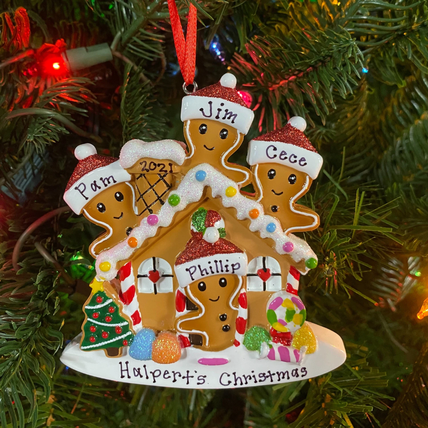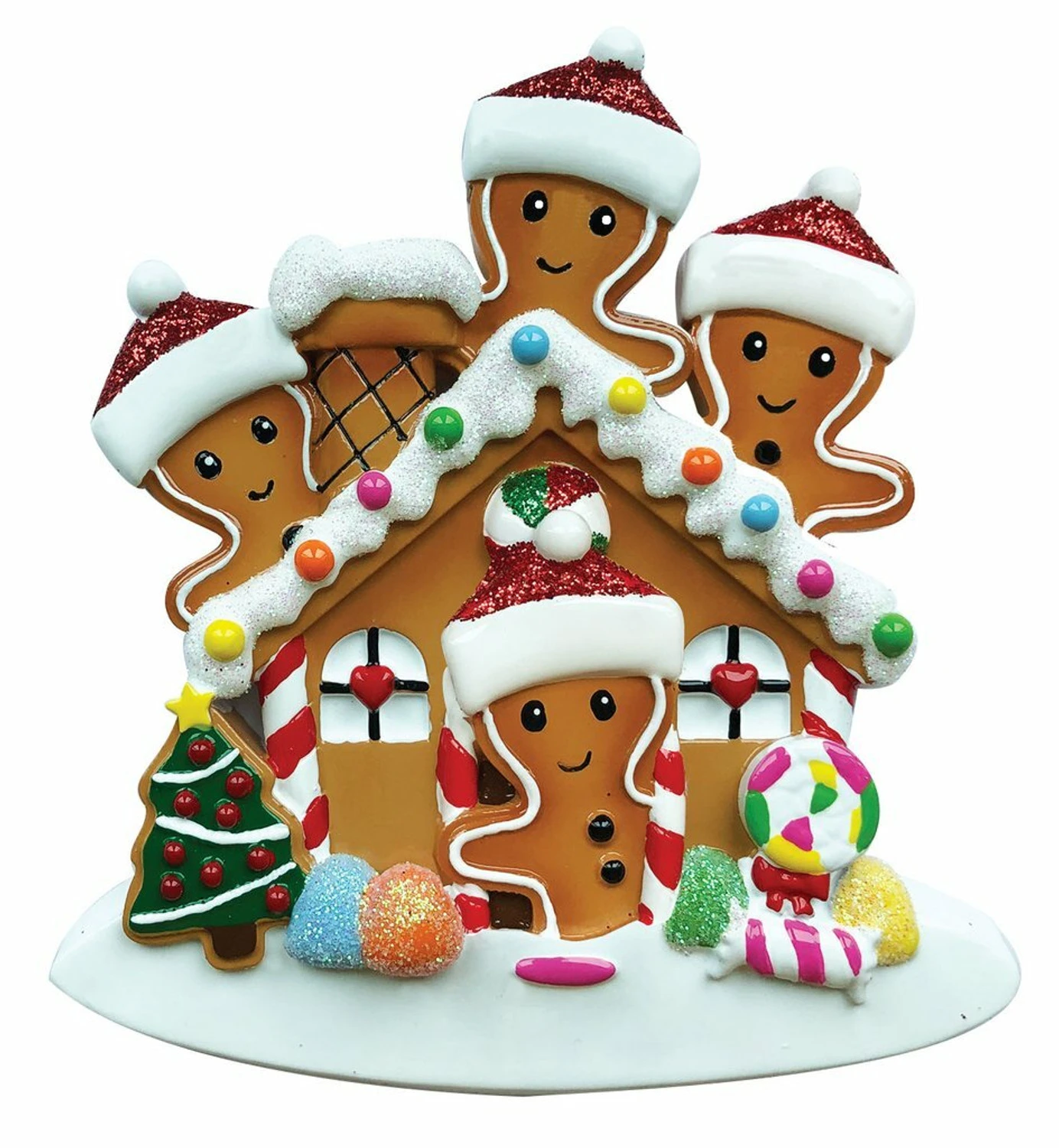 Get each of your sweet family members names on a cute as can be keepsake ornament! This ornament features a gorgeous gingerbread house with 4 small gingerbread cookies wearing hats where you can get their names! You can also get the family name or “Christmas 2021” at the bottom on the snow bank! Made of resin. Dimensions: 3.75″ x 4.25″. Item #: OR1872-4