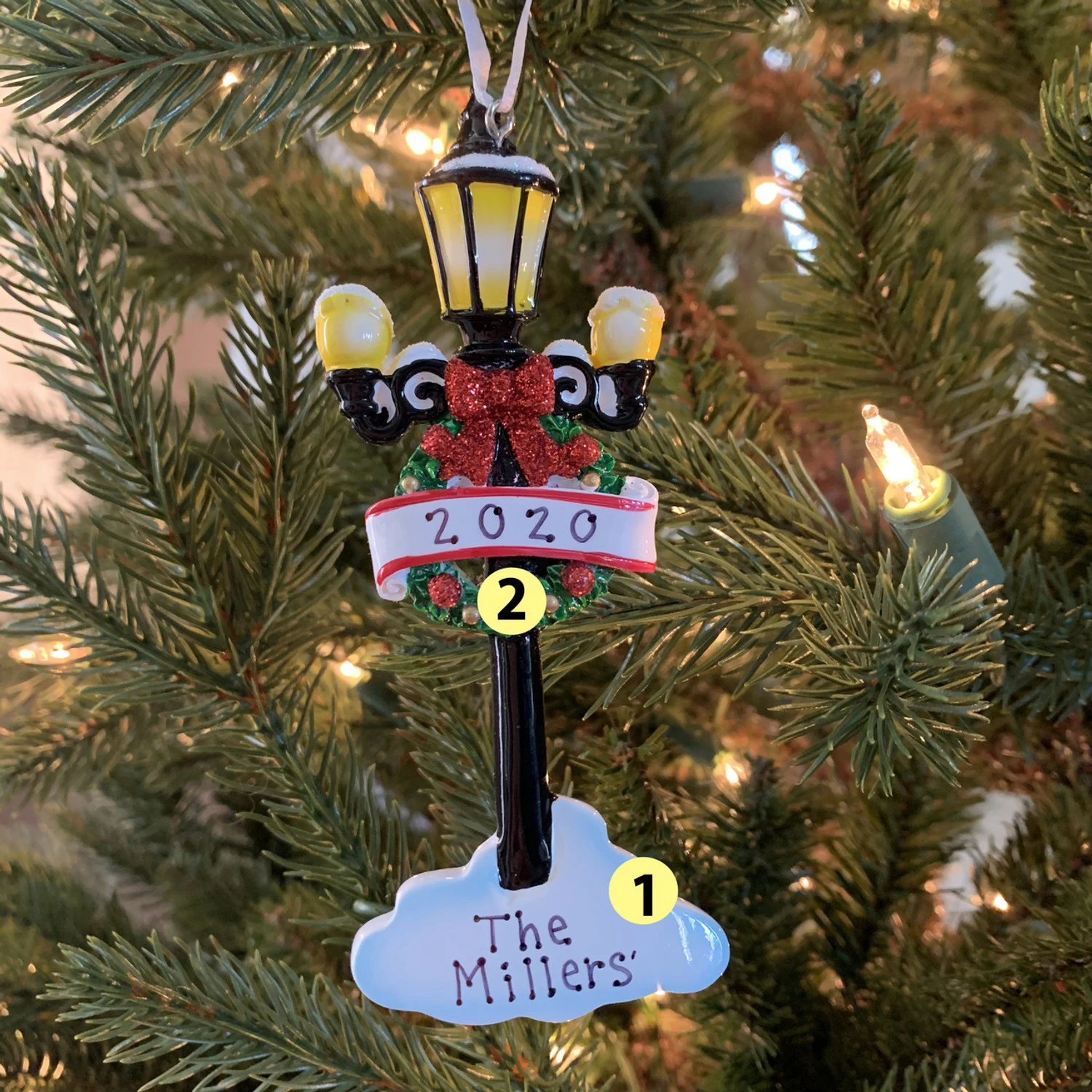 Have someone who is a light in your life?? This is such a cute ornament for them! It features a gorgeous black lamp post with bright yellow lights decorated with a wreath with a bright red glittered bow! Across the wreath sits a white banner for you to write a name on, and put the date at the bottom! Made of resin. Dimensions: 2″ x 4.75″. Item #: OR1862