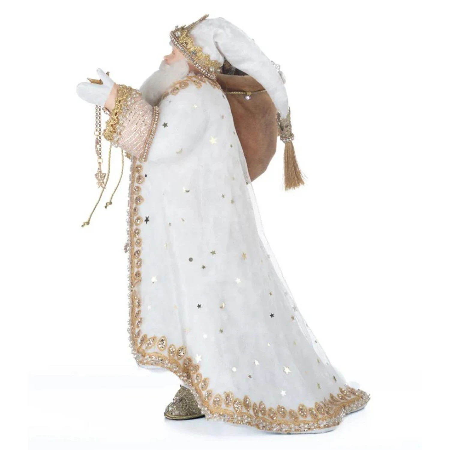 Santa has on an outfit that would make galaxies jealous! He wears a long white robe with a tulle overlay dotted with tiny golden stars and a stunning gold embroidery and glitter detail around the edge of the robe. His shirt from underneath pokes out with a lovely champagne color dotted with jewel buttons. His pants are a unique teeny tiny pin stripe of gold and whites neatly tucked into a pair of bright white boots with gold detailing. Over his shoulder he holds a large gold toy bag filled with silver and gold wrapped gifts and stars! Made by Katherine’s Collection. Made of resin, paper mache, and fabric. Dimensions: 10 × 9.75 × 13.75 in. Item #: 28-328826