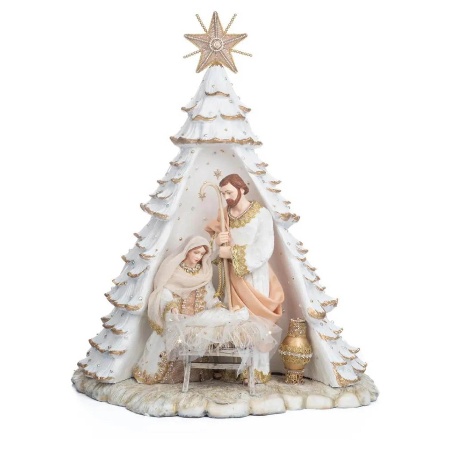 The holy family are all dressed in gorgeous white robes with gold embroidery detailing as they sit underneath a with Christmas tree dotted with small jewels and gold tipped branches. Jesus’ manger is filled with white tulle dotted with small gold glittered star flecks as his parents gaze down onto him. Made by Katherine’s Collection. Made of resin, paper mache, and fabric. Dimensions: 19.75 × 8.75 × 24.25 in. Item #: 28-328835