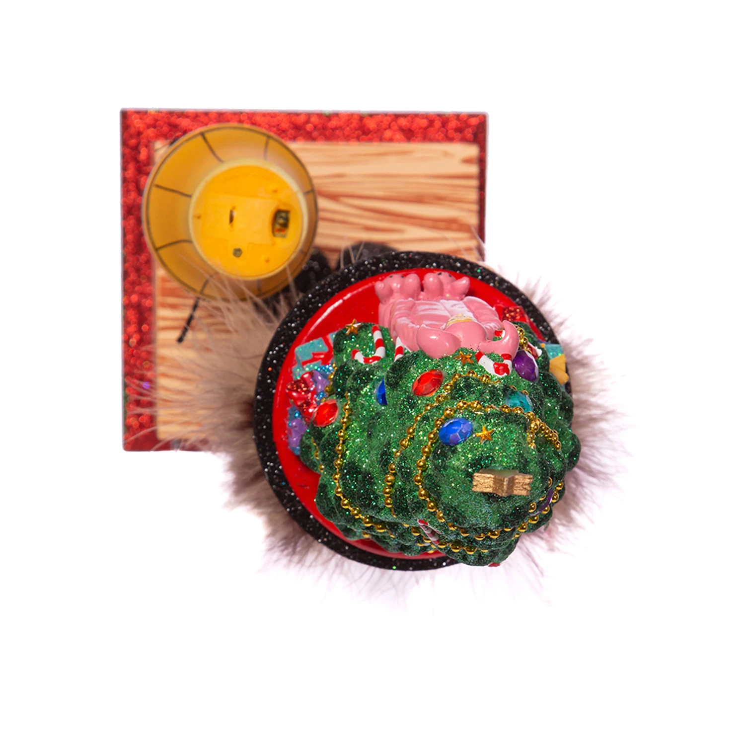 This nutcracker features a nutcracker dressed as Ralphie’s dad in a brown glittered suit perched on top of the famous FRAGILE box with his beloved leg lamp set up next to him! In top of his head sits a large, beautifully decorated Christmas tree surrounded by glittering presents and Ralphie in his bright pink bunny suit! Made by Kurt Adler. Made of wood. Dimensions: 15″ x 6.5″. Item #: CS6201L