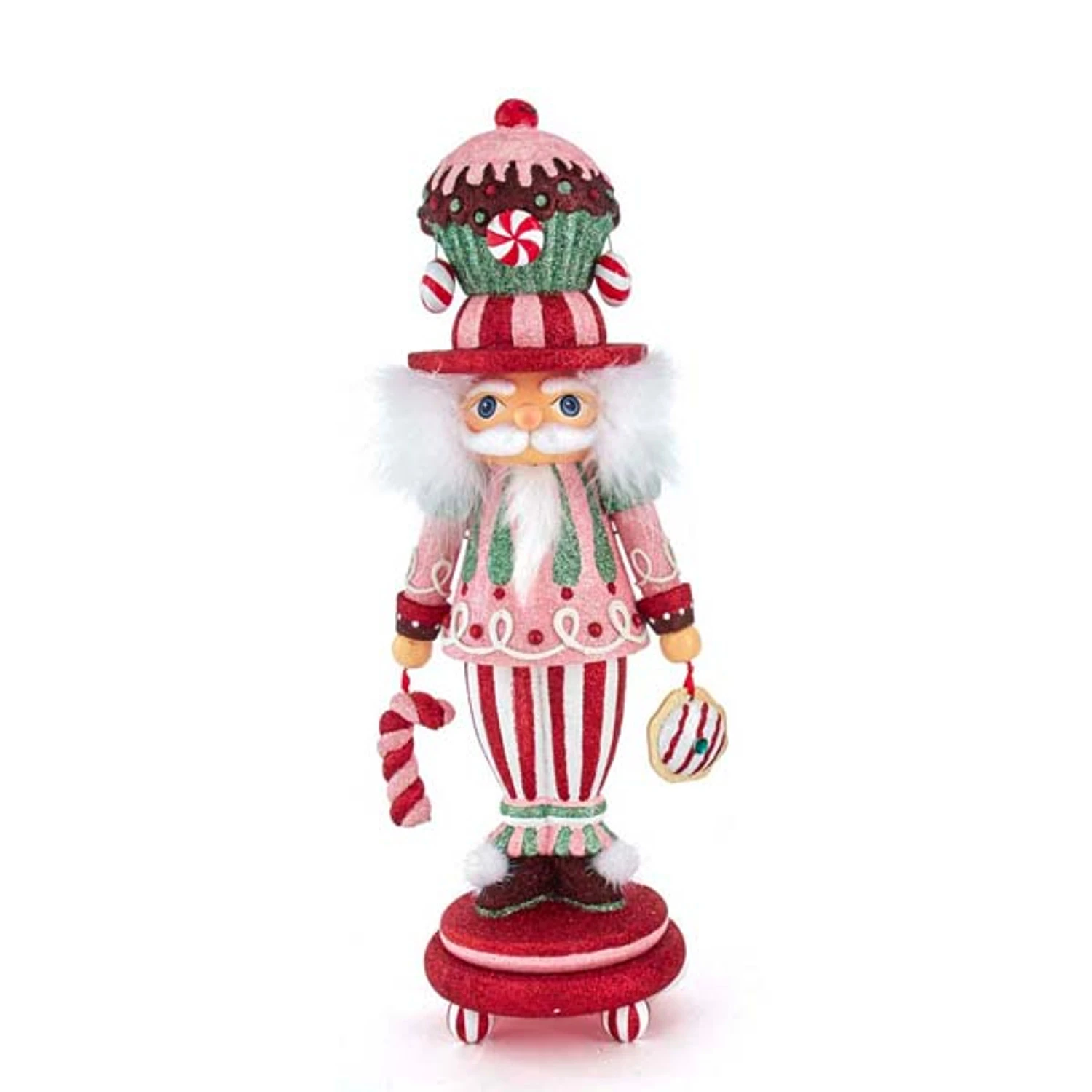 These little guys are pretty in pink! Each one of these stunning nutcrackers feature white, pink, red, and green glittered outfits with glittering treats in their hands! Choose the nutcracker with a chocolate frosting cupcake on his head or the nutcracker with an overflowing green glittering mug of hot cocoa! Each sold individually. Made by Kurt Adler. Made of wood. Dimensions: 16.5″ tall. Item #: HA0515