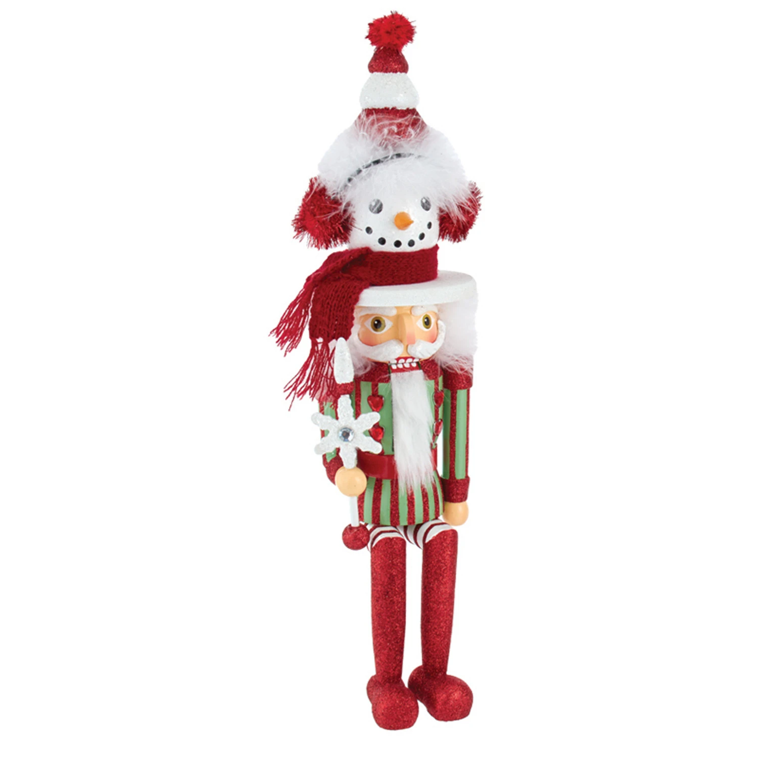 Adorn your shelf with these gorgeous little nutcrackers! Hollywood Nutcrackers are known for their flashy appearance! Each one of these are covered in bright red and green glitter and jewels! They have on striped pants and a flat bottom to sit snuggly on your mantle. Choose between a nutcracker topped with a snowman face wearing a cozy hat, a nutcracker topped with a green present with polka dots, or a nutcracker topped with a giant white glittered tree dotted with red stars! Each sold individually. Made by Kurt Adler. Made of wood. Dimensions: 17″ x 5″ x 5″. Item #: HA0541