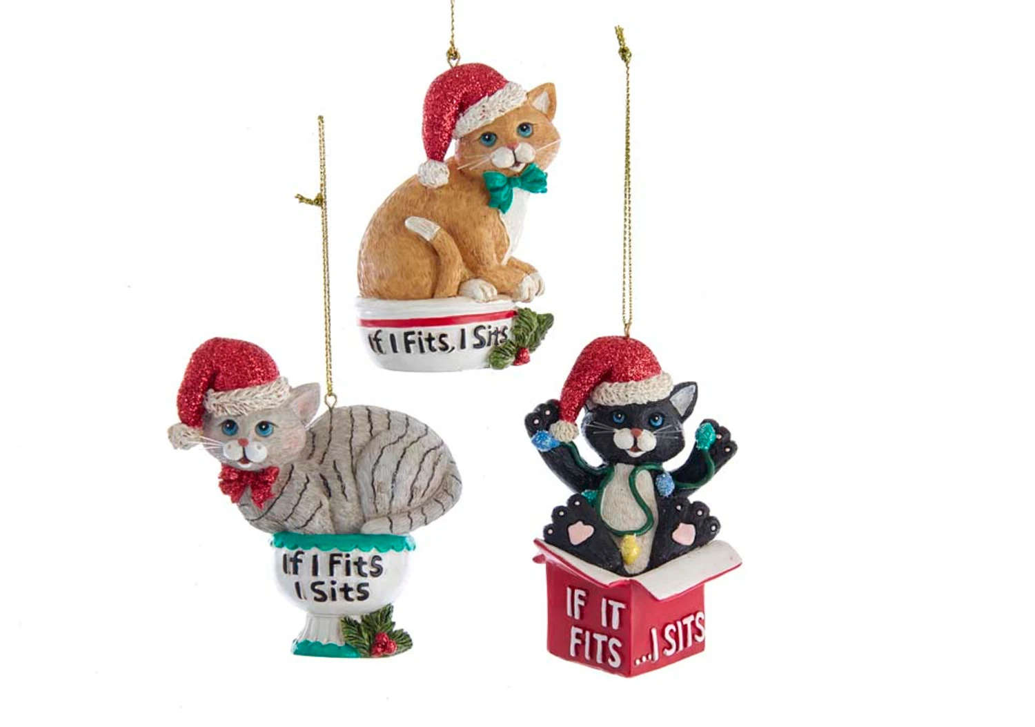 We all know our beloved feline friends love to squeeze themselves into small, cozy spaces. Choose a bright orange cat in a food bowl, a grey cat in a cup, or a black cat in a box! Each one wears a Santa hat! This would make the perfect gift for the cat lovers on your list! Made by Kurt Adler. Made of resin. Dimensions: 3.25″. Item #: E0599Â