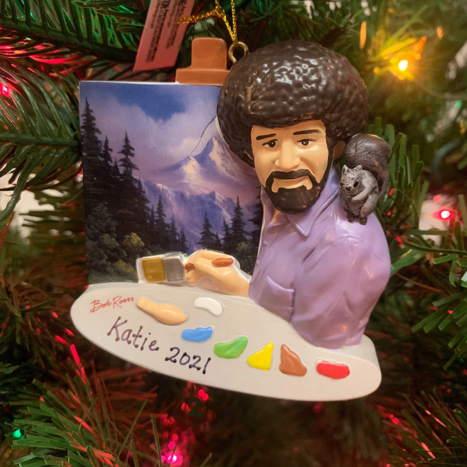 Do you love to paint happy trees? We sure do! Snag this amazing Bob Ross ornament for the artist on your Christmas list! It features the famous painter with his infamous hair standing in front of a lovely painting holding a brush and paint pallet. Add the name and the year of the artist on your list for a wonderful keepsake! Made by Kurt Adler. Made of resin. Dimensions: 3.5″ x 3.2″. Item #: BO2201Â