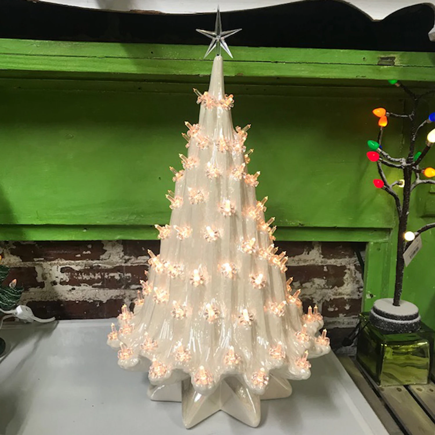This white ceramic Christmas tree is called an ice tree, named after it’s sharp lines and edges. This vintage inspired tree was created for us by local artisans. The tree includes a base, interior light bulb, clear Christmas tree bulbs, and tree. The tree stands 23″ with star or 21″ without the star and is 13″ wide.