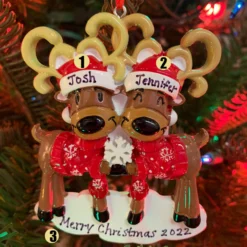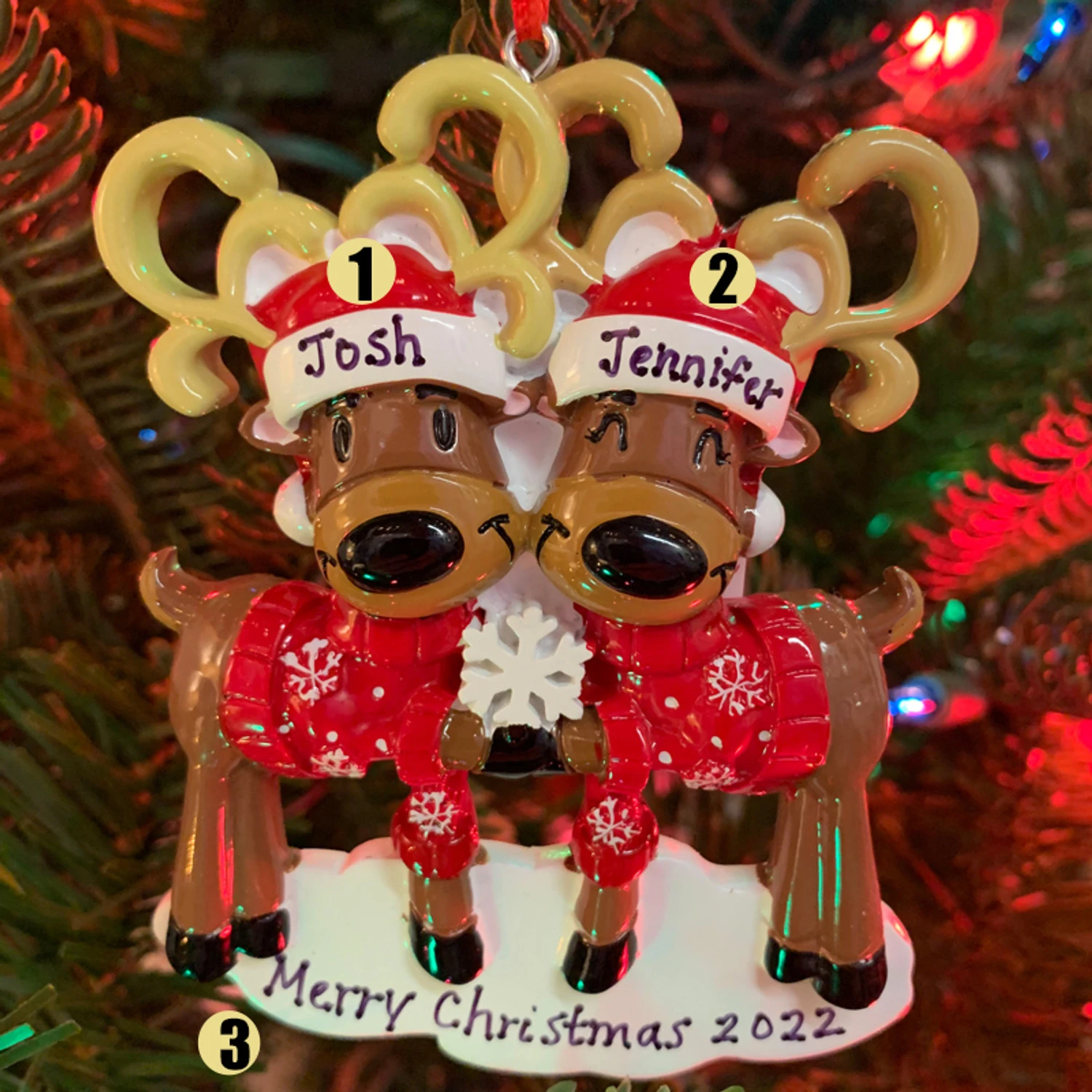 Celebrate you and your loved one this holiday season with this adorable reindeer couple! Each one has on a matching red sweater with white snowflakes and happily hold a white snowflake in their hooves! With smiling faces, this is sure to be a keepsake that you will cherish for Christmases to come! Get your names and the year written to commemorate your love! Made of resin. Item #: OR2256-2Â
