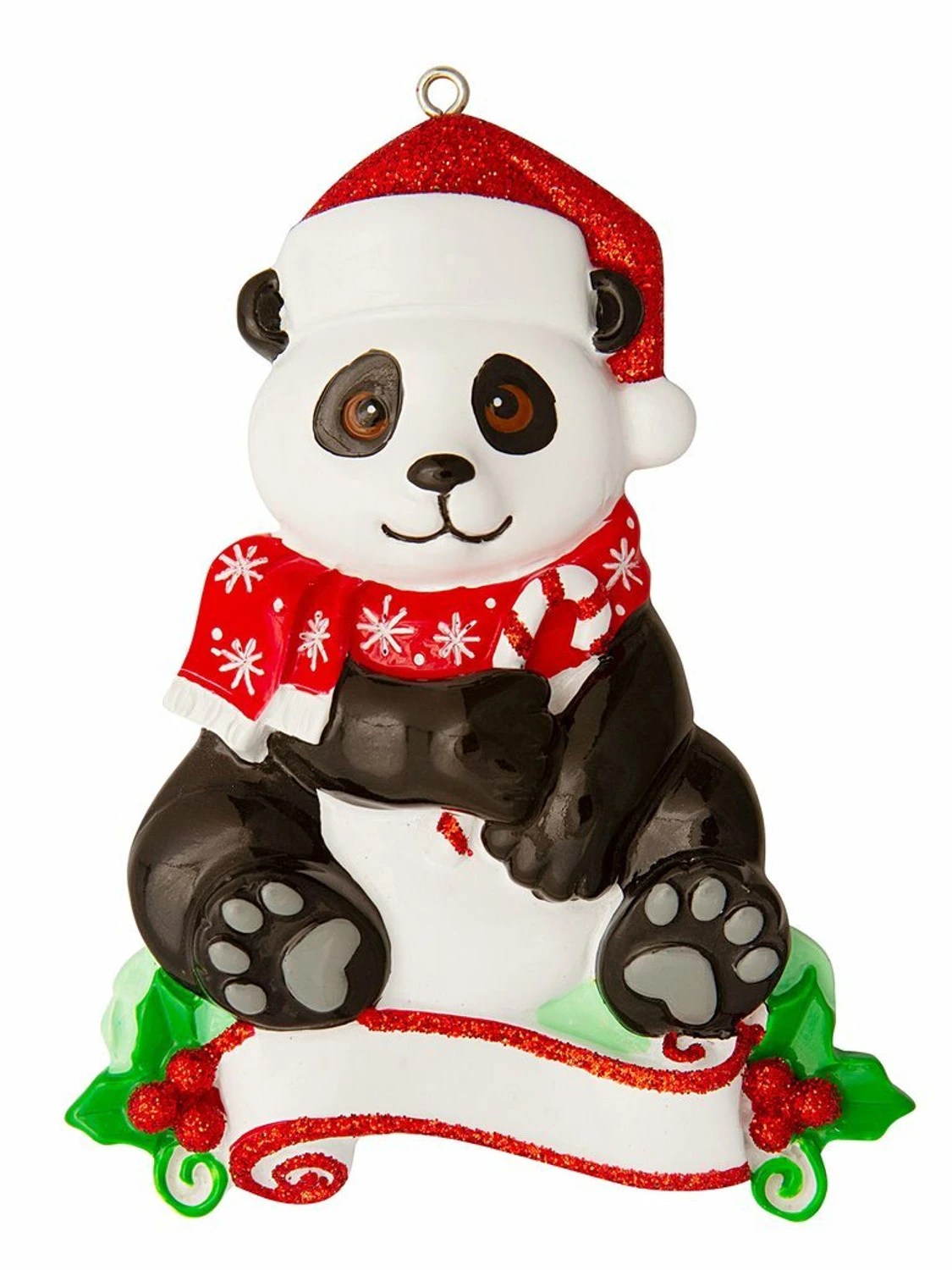 This little guy is bundled up and ready for Christmas! It features a panda in a red hat and scarf holding a glittered candy cane! Get the year written on his hat and “Merry Christmas” or your name written on the banner below him! Made of resin. Dimensions: 3″ x 4″. Item #: OR1850-P