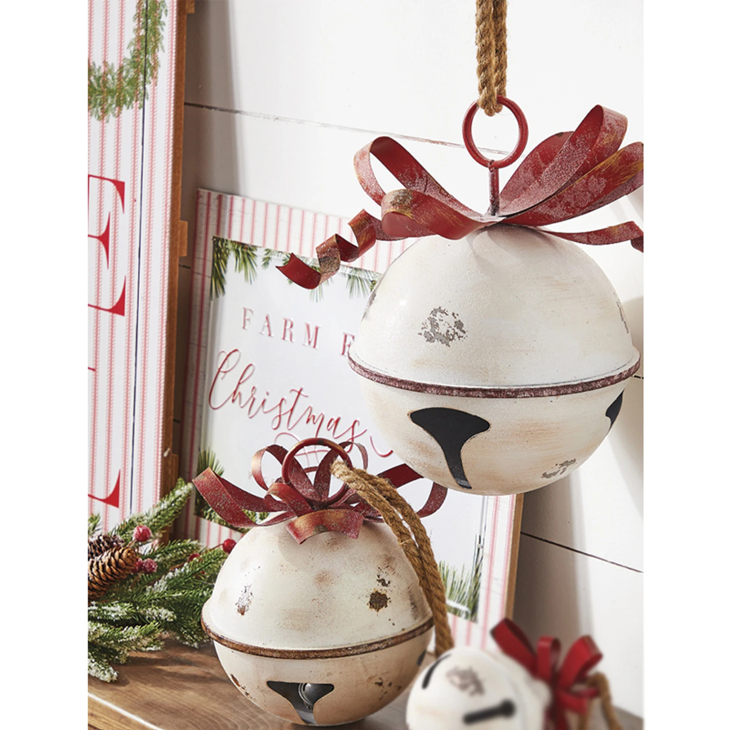 These rustic bell Christmas ornaments are perfect to hang on your covered porch, on the corner of your mantle, or even put them in your tree! Each one is a rustic white color with a red metal bow on the top! Each sold individually. Made by Raz Imports. Made of metal. Dimensions: 11″ or 13.5″. Item #: 4015935 or 4015934