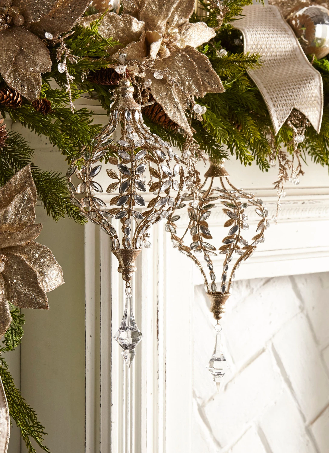 Decorate your tree with these stunning large finials! Each one is a fun shape covered in champagne glitter and silver jewels! Below the finial dangles a gorgeous jewel with brilliantly cut facets sure to reflect light wonderfully! Each sold individually OR you can purchase as a set. Made by Raz Imports. Made of metal and plastic. Dimensions: 6.5″D X 14″H. Item #: 4313510