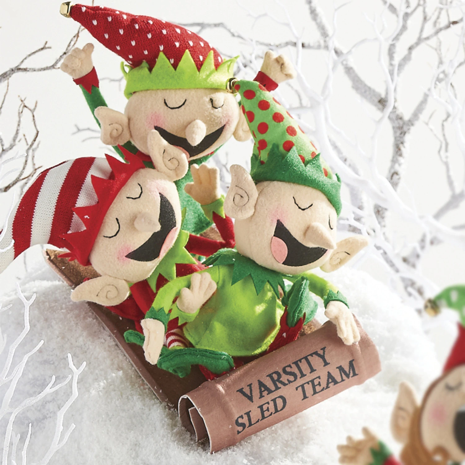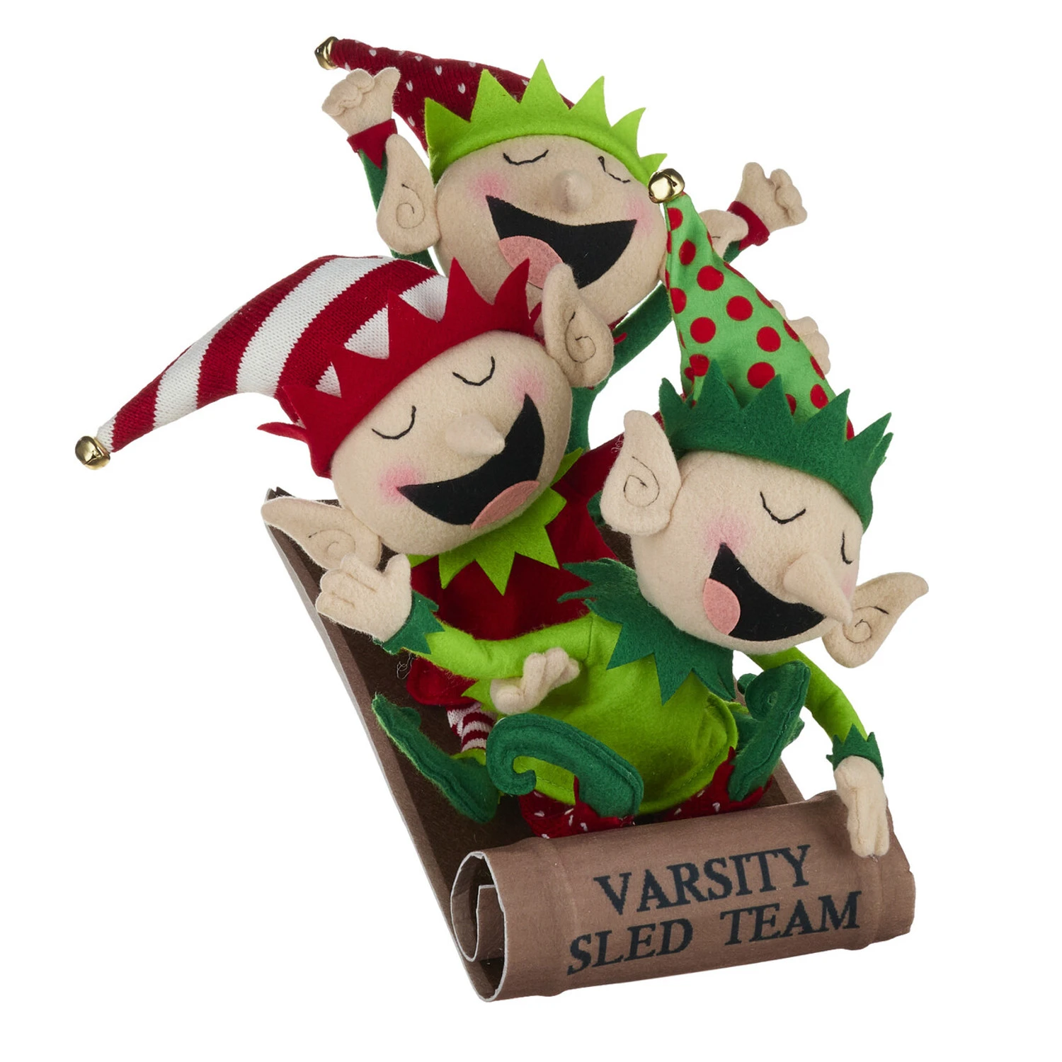 Time for practice! These energetic elves are ready to go as fast as they can possibly go on their sled! This figure features three happy elves piled on a brown sled from the varsity team and plowing down the hill !Perfect to place in your Christmas tree or on your mantle! Made by Raz Imports. Made of polyester and acrylic. Dimensions: 16″ L x 11″ W x 9″ H. Item #: 4116347
