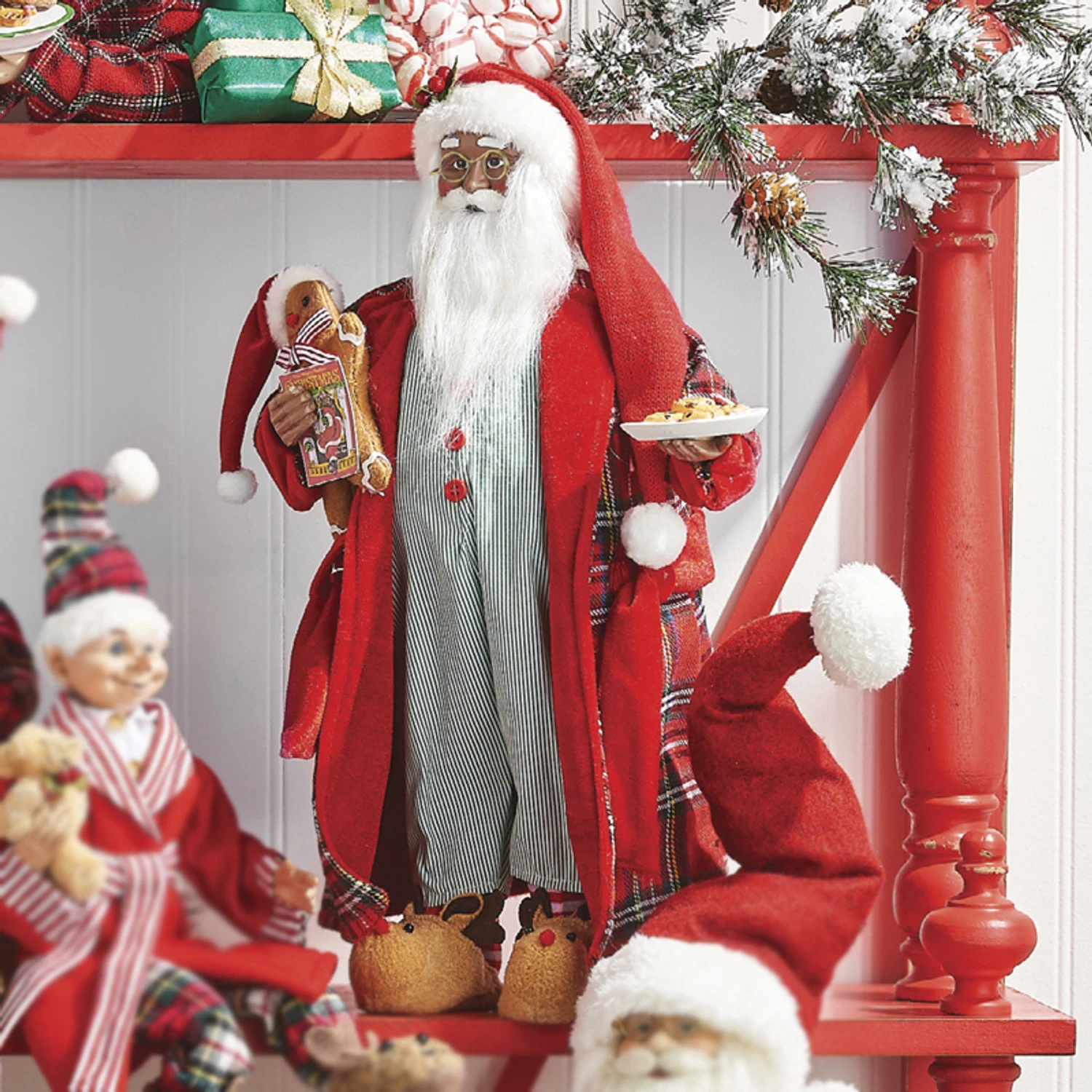 Santa is ready for a fun night in! He’s dressed in green and white pin stripe pj’s with red buttons and a red plaid robe over top! In one hand he holds a stuffed gingerbread toy with a bedtime story and in the other a plate of freshly baked cookies! Check out all of our African American Christmas decorations here Made by Raz Imports. Made of polyester and plastic. Dimensions: 10.75″ L x 7.75″ W x 18″ H. Item #: 4115558