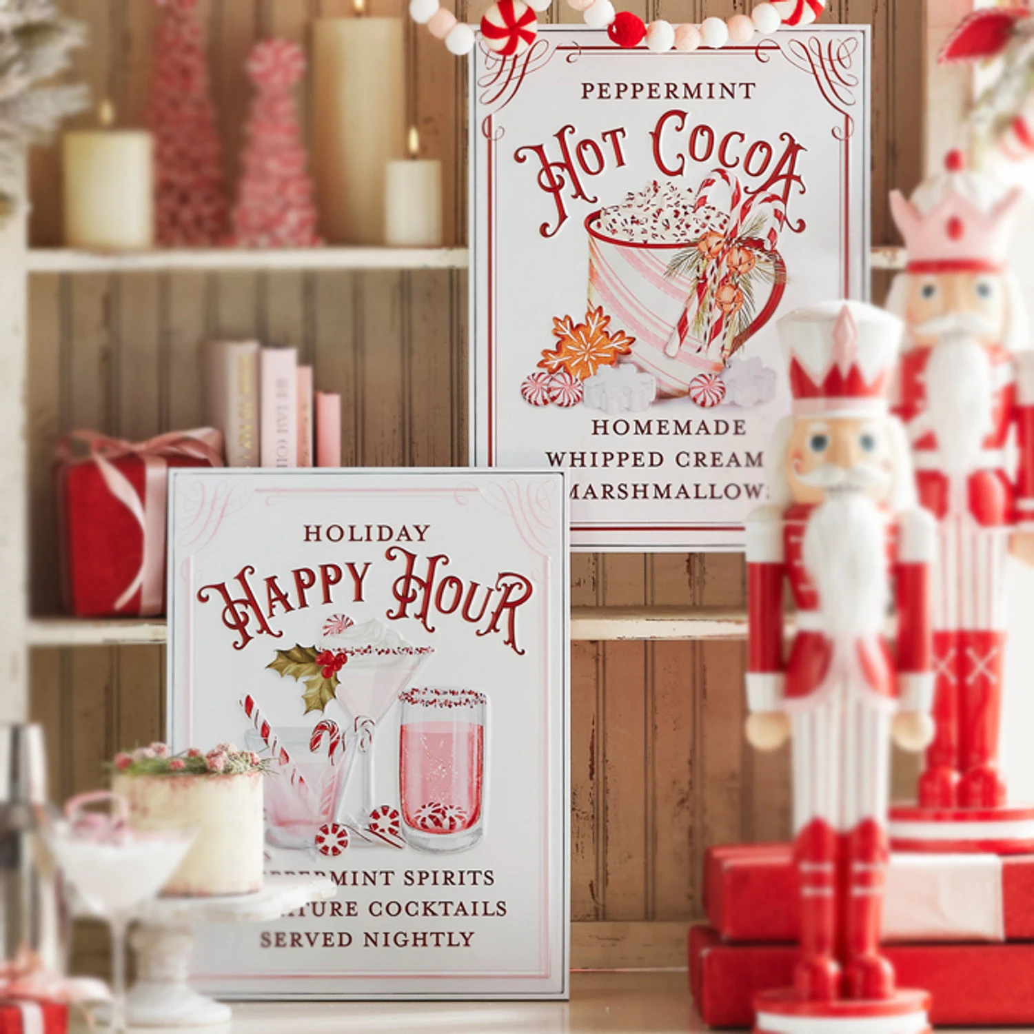 Be in high *spirits* this holiday season! Celebrate your friends and family with a drink…or two! Each sign is a pretty white with pink and red accents with peppermint drinks on the front and adorable Christmas sayings! Choose between the Christmas cocktails sign or the hot cocoa sign. Each sold individually. Made by Raz Imports. Made of metal. Dimensions: 13.75″L X 0.75″W X 18″H. Item #: 4359013