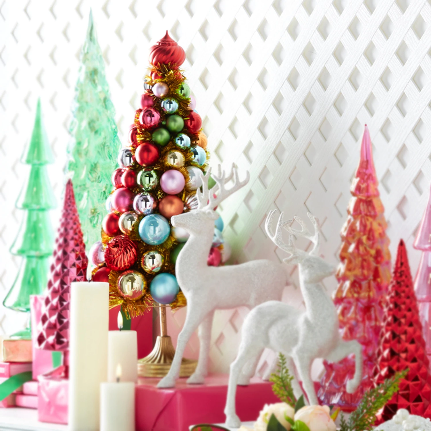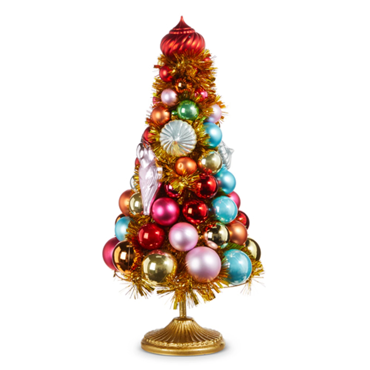 Stun your guests with these gorgeous trees! Each one features a gold tinsel tree covered in brilliantly colored vintage inspired Christmas ornaments of different shapes and sizes! The base is a pretty ornate gold circle! Perfect to place up on your mantle this year! Each sold individually. Made by Raz Imports. Made of iron and plastic. Dimensions: 8″ D X 18″ H or 8.5″ D X 21″ H. Item #: 4320074 or 4320081