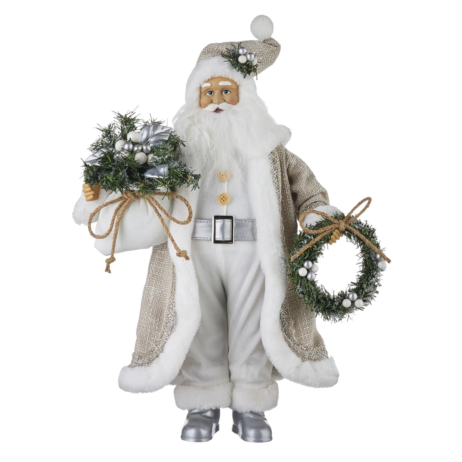 Here comes Santa Claus! He’s dressed in a lovely simple color palette of silver and natural tan. His suit is white with a silver belt and tan buttons. His coat is a jute tan with white fur trim! In one hand he holds a bag full of silver ornaments and greenery, in the other is a wreath with a tan bow and silver ornaments! Made by Raz Imports. Made of polyester and resin. Dimensions: 11.5″ L x 9″ W x 18″ H. Item #: 4115579