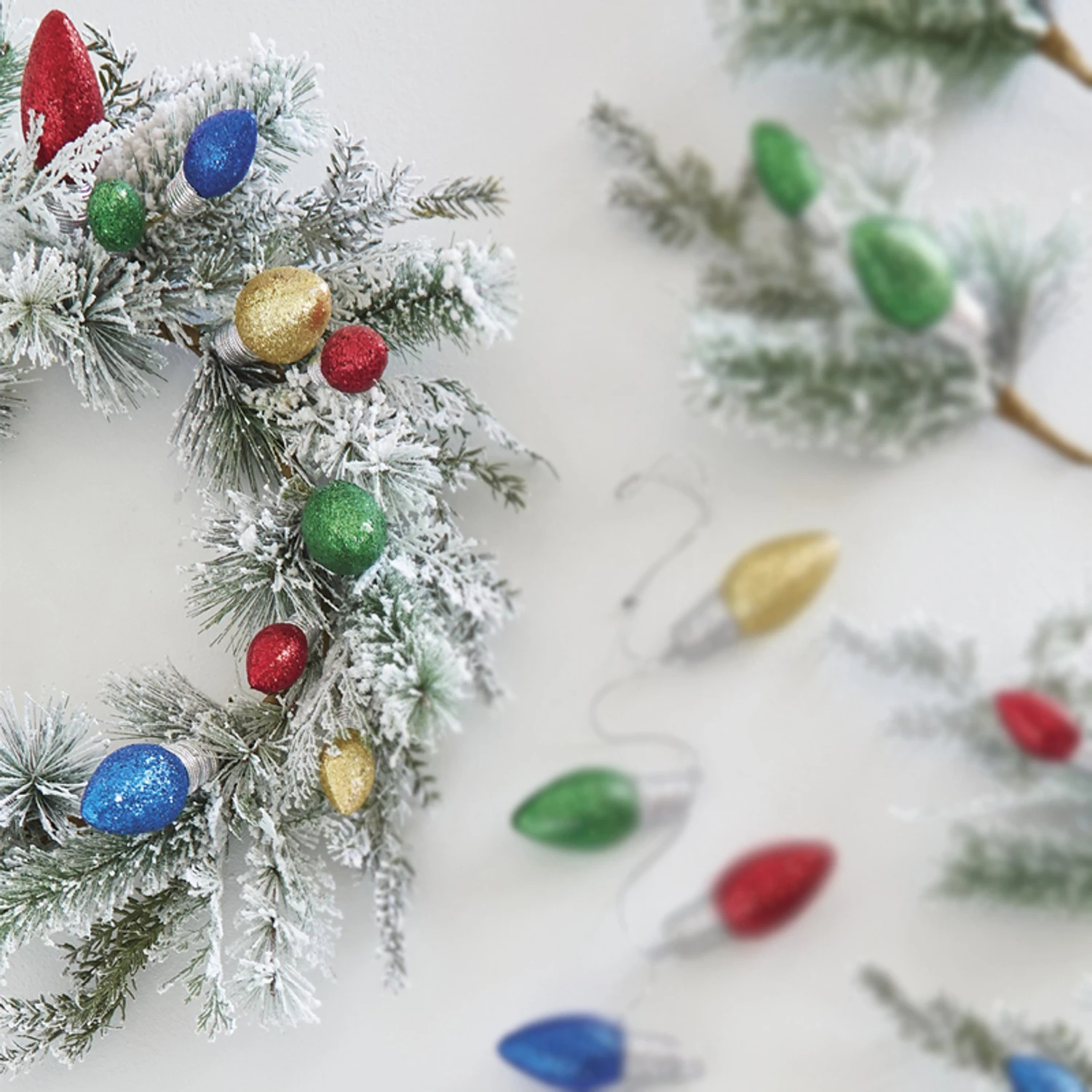 We love a good flocked wreath! This one features fluffy green branches with a coating of white flocked snow with red, blue, green, and gold glittered c7 lights bulbs placed throughout! Made by Raz Imports. Made of plastic and foam. Dimensions: 22″. Item #: W4206875Â