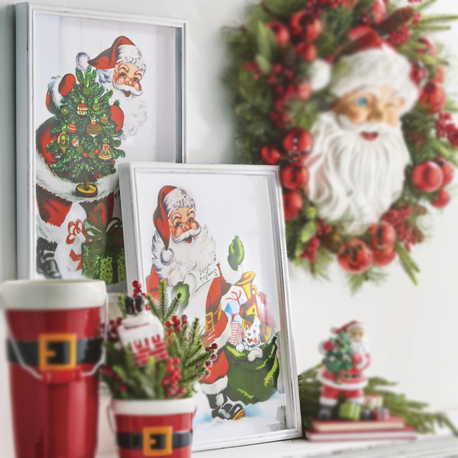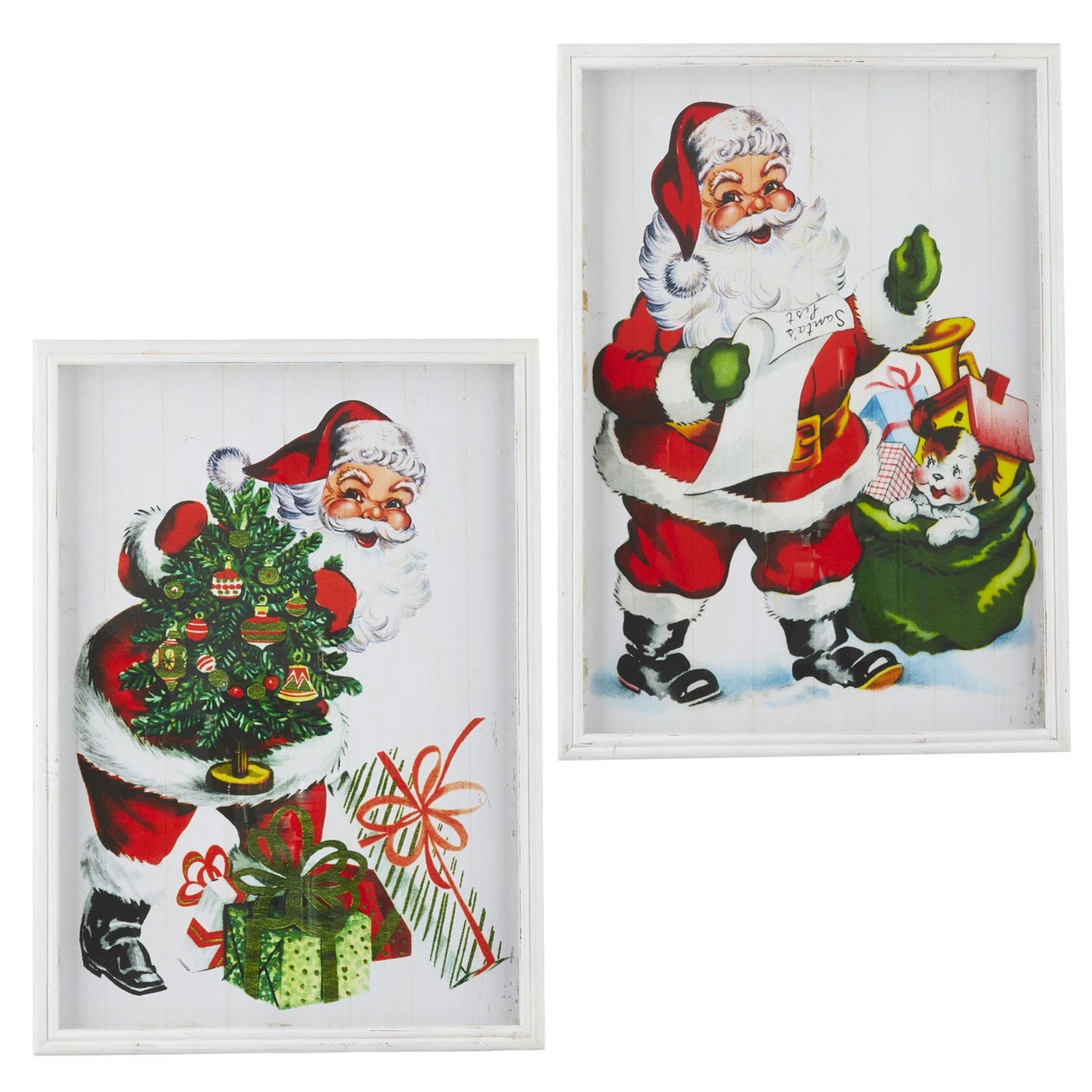 Hang these adorable Santa frames above your mantle for a gorgeous holiday look! Each one features a vintage inspired Santa image with tons of bright and bold colors! Santa has blushing cheeks and his red suit. Choose between Santa holding a tree, or Santa with his toy bag! Each sold individually. Made by Raz Imports. Made of wood and glass. Dimensions: 15.75″L x 1.5″W x 22″H. Item #: 4144599