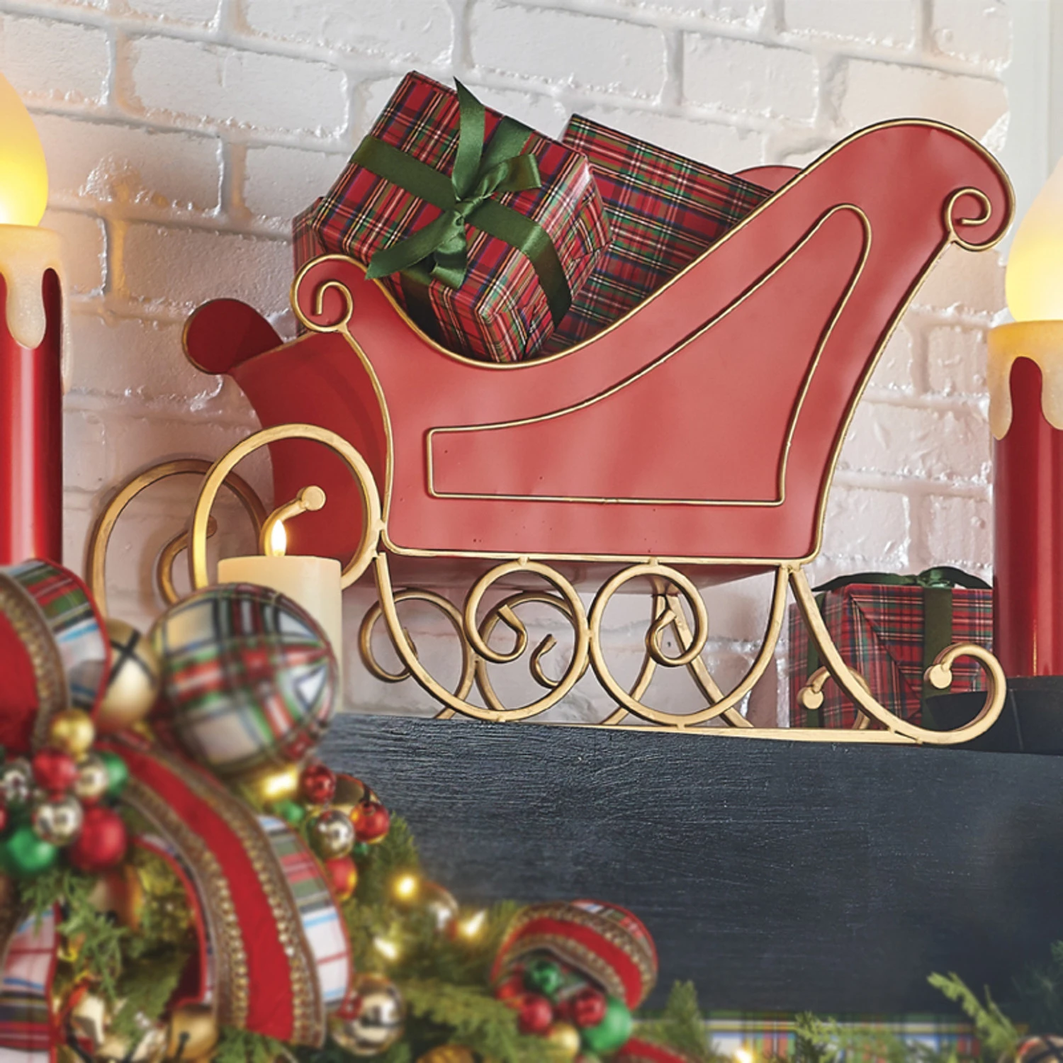Place this adorable red metal and gold sleigh up on your mantle or use on your dining table as a center piece! You can place your favorite posable elf or fill it with pretty greenery! Made by Raz Imports. Made of metal. Dimensions: 24.25″. Item #: 4211153