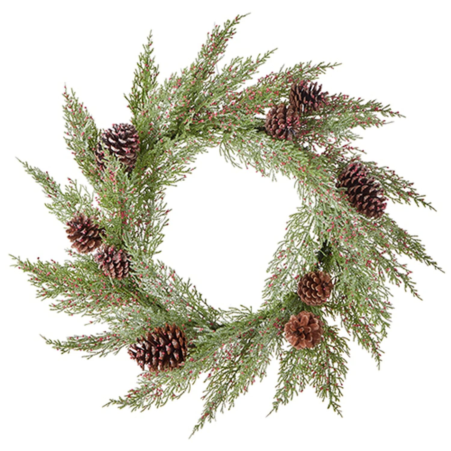 This wreath features lush cedar branches dusted with tiny red berries and pinecones dotted throughout the wreath! Great to hang on your front door to greet your guests or hang above your mantle! Made by Raz Imports. Made of plastic and pinecone. Dimensions: 24″. Item #: W4202569