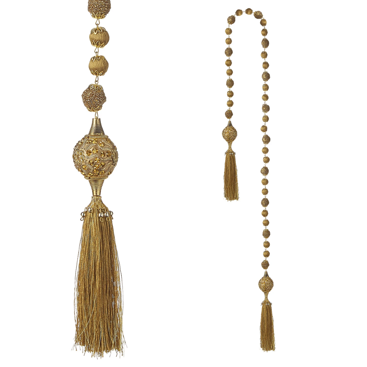 Use this beautiful garland to drape on the outer branches of your Christmas tree for a fun look! It features a gold bead strand with fluffy golden tassels on the ends! Made by Raz Imports. Made of plastic and polyester. Dimensions: 3.75′. Item #: G4127308