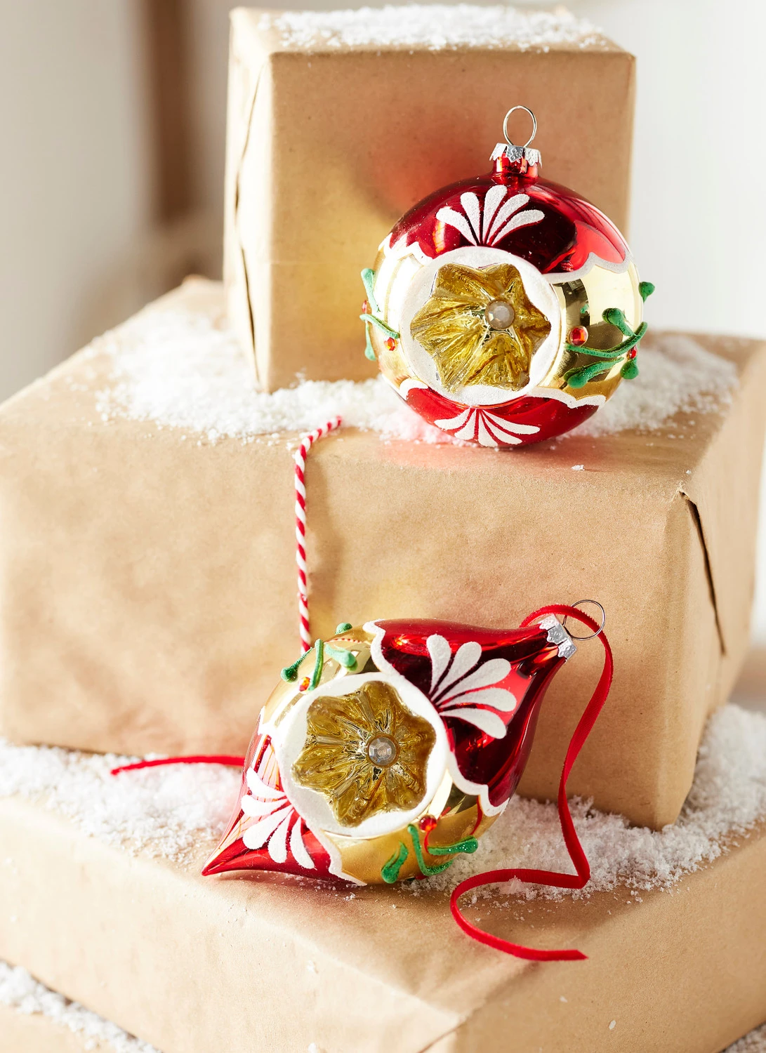 The ornaments feature red and gold glass shaped with a reflector in the center trimmed with white and decorated with holly leaves and berries! Sold individually or as a SET of 2. Made by Raz Imports. Made of glass. Dimensions: round: 3″D X 3″H, finial: 3″D X 5″H. Item #: 4320019