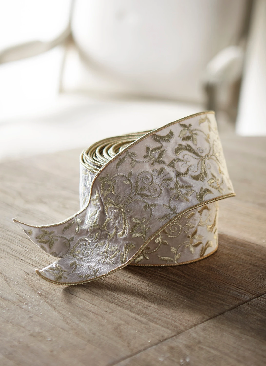 This stunning ribbon features an ivory and champagne patterned embroidered in it with champagne embroidery trim. Made of polyester. Made by Raz Imports. Dimensions: 4″ x 10 yards. Item #: R4371784