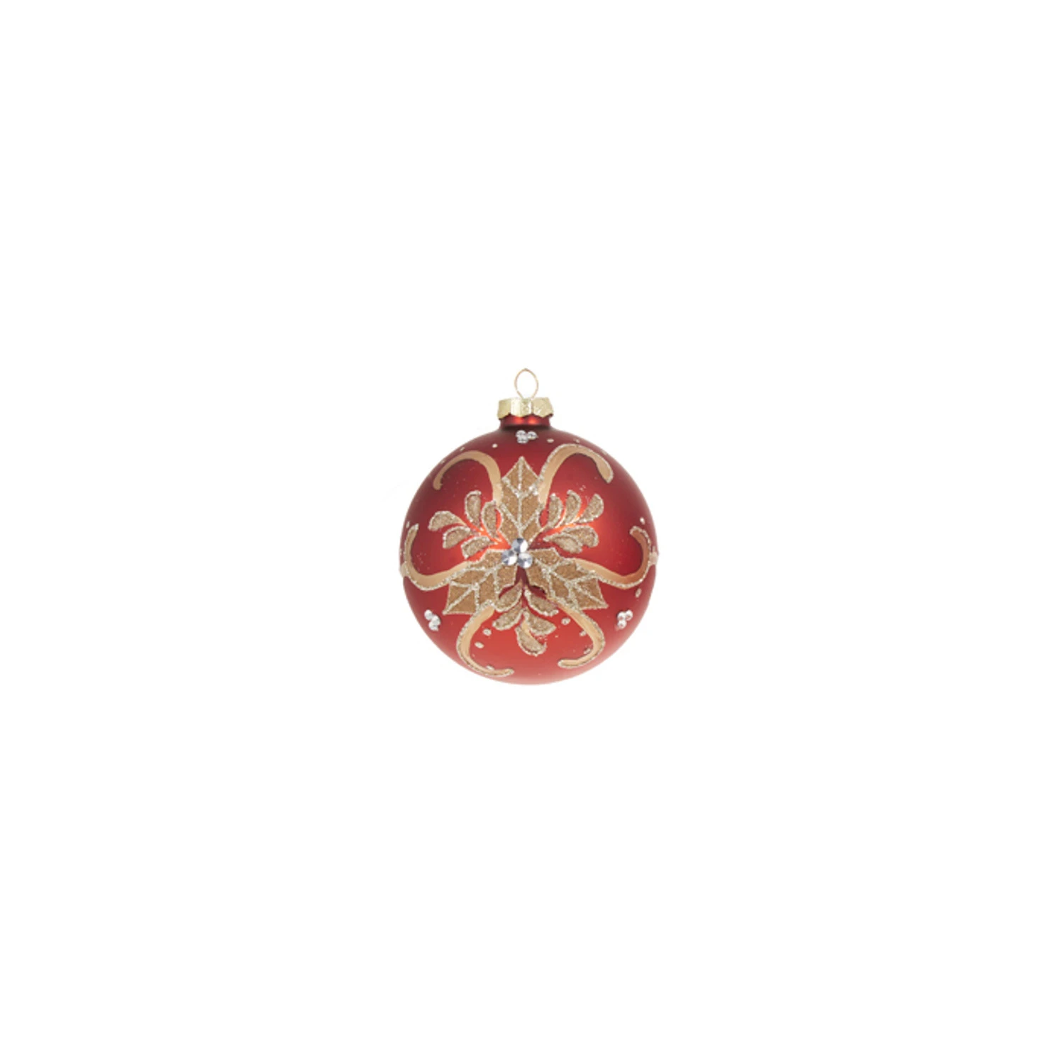 Decorate your tree with these pretty red ornaments! Each one features a matte red glass decorated with gold holly leaves covered in gold glitter, and gold ticks and silvery jewels! Each sold individually OR as a set! Made by Raz Imports. Made of glass. Dimensions: 4″. Item #: 4322839