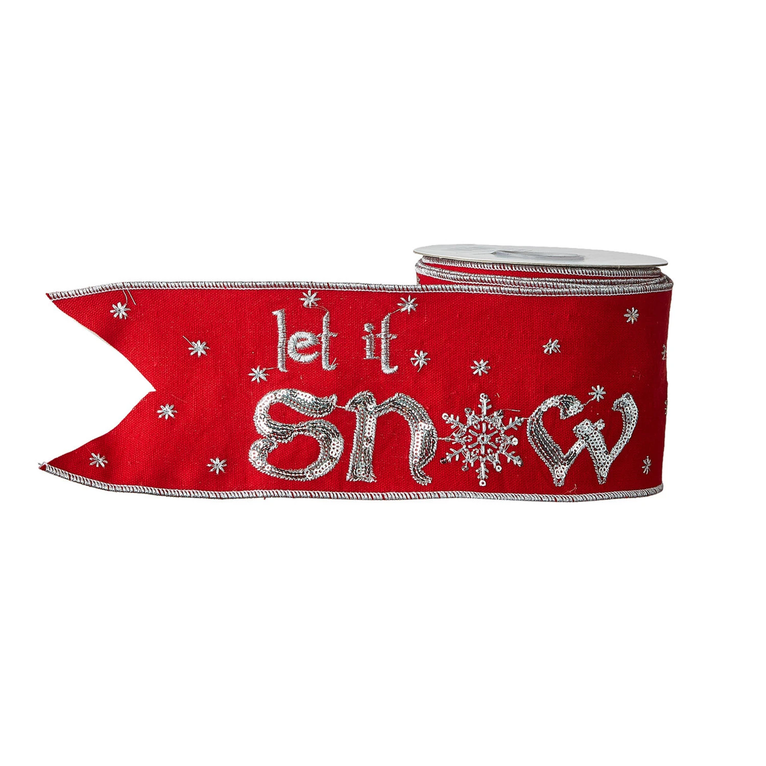 Let it snow! Let it snow! This gorgeous ribbon features a bright red ribbon with silver trim and embroidery with “snow” in silver sequins and a snowflake as the “o”! This would look so pretty weaved throughout your tree or as a bow! Made by Raz Imports. Made of polyester. Dimensions: 4″ x 10 yards. Item #: R4127755