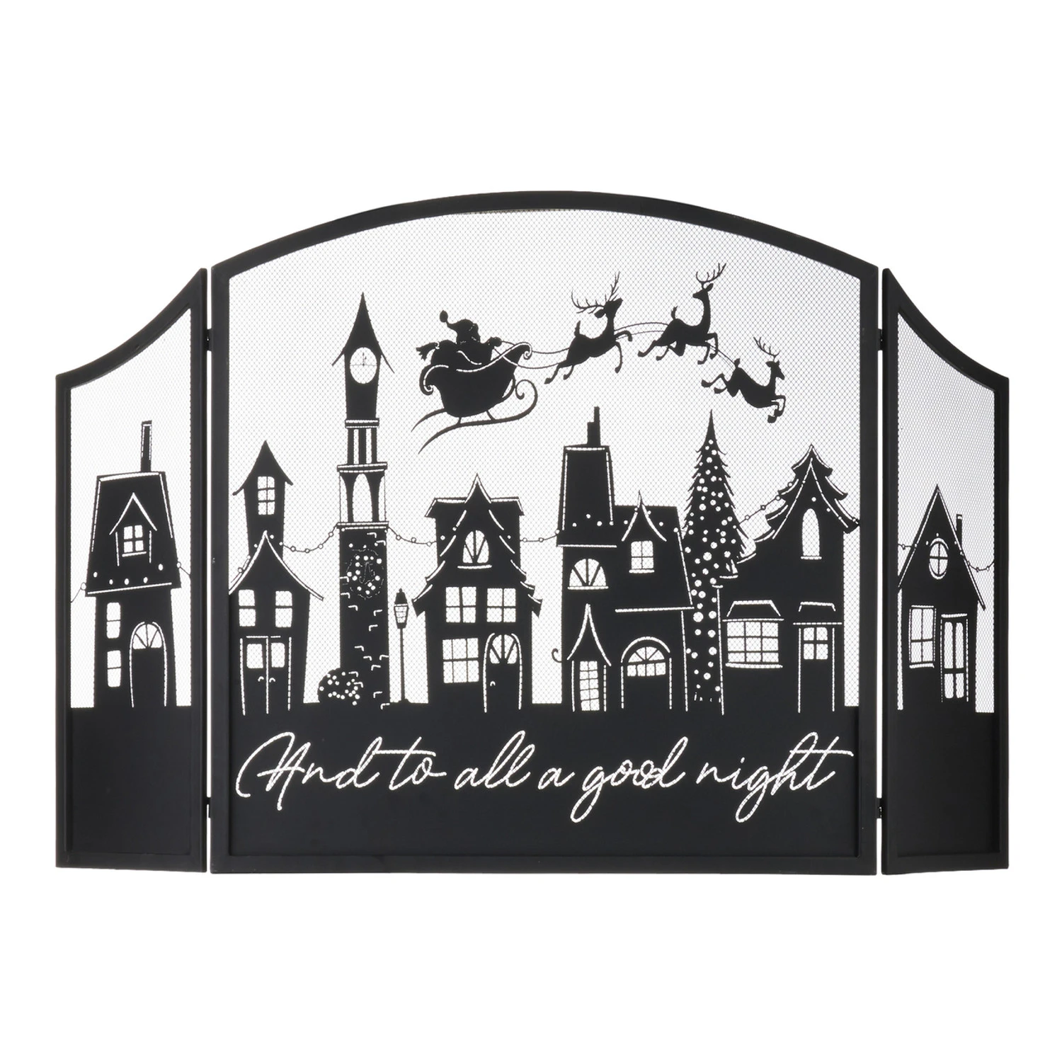 Give your mantle an update with this stunning fireplace screen! It features a sleek black three paneled screen with a winter town scene and Santa flying across the sky! At the bottom of the screen “And To All A Good Night” is written is a lovely font. Made by Raz Imports. Made of iron. Dimensions: 48″ L x 0.5″ W x 29″ H. Item #: 4117027