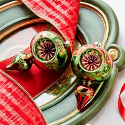 These pretty little finials feature red and green glass with gold glitter detailing and a stunning reflector in the center! Each sold individually or as a SET of 2. Made by Raz Imports. Made of glass. Dimensions: 5″. Item #: 4320017