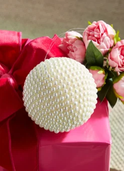 Adorn your tree with this cute as can be ornament! It features a ball ornament covered in small pearl beads! It’s sure to bring a touch of cuteness and elegance to your tree, wreath, or garland! Made by Raz Imports. Made of plastic and foam. Dimensions: 5″. Item #: 4302379
