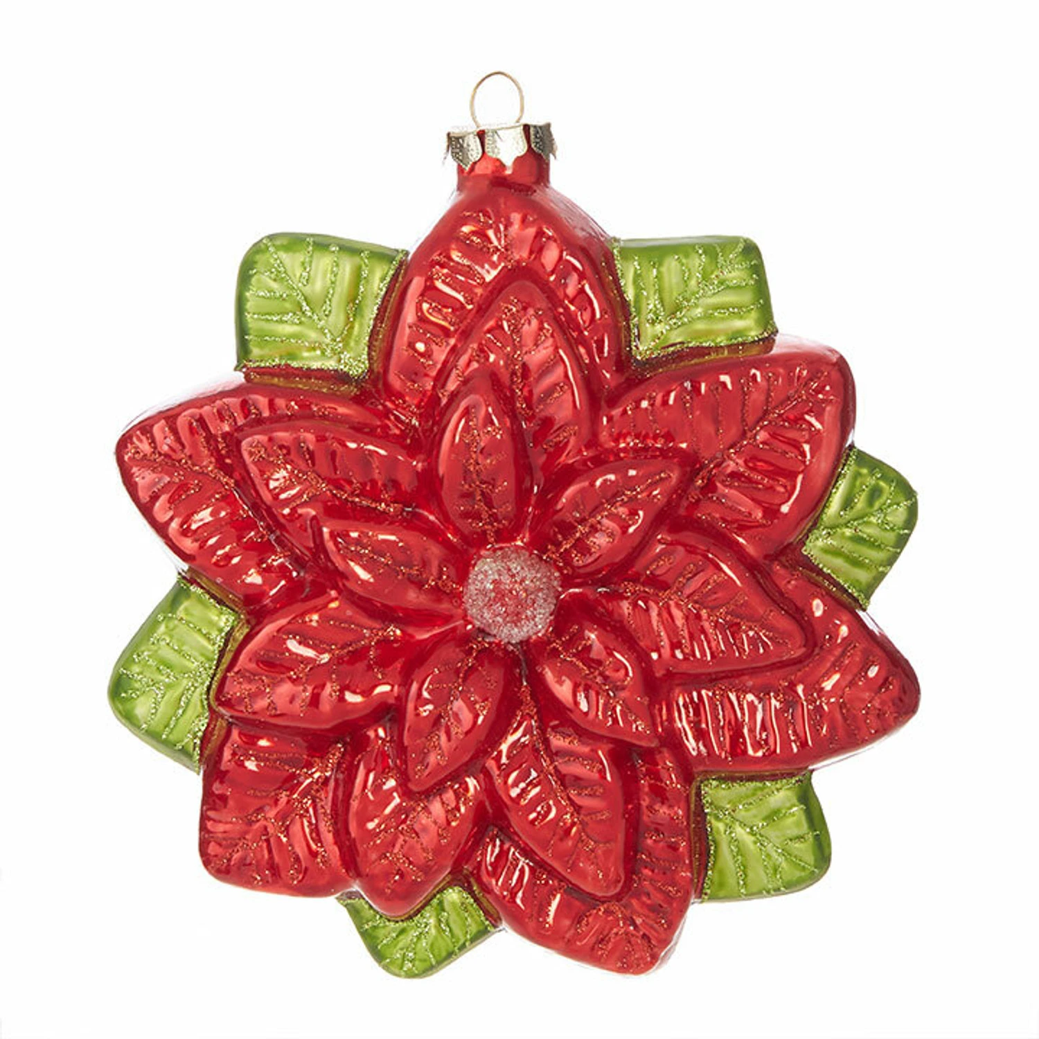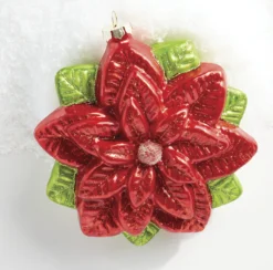 This gorgeous poinsettia ornament is sure to be your new favorite! It features bright red poinsettia leaves with fine detailing and glitter accents! Green leaves poke out around the edges! Perfect to hang a few in your Christmas tree, add them to a wreath, or dot them throughout a garland! Made by Raz Imports. Made of glass. Dimensions: 6.5″. Item #: 4019189