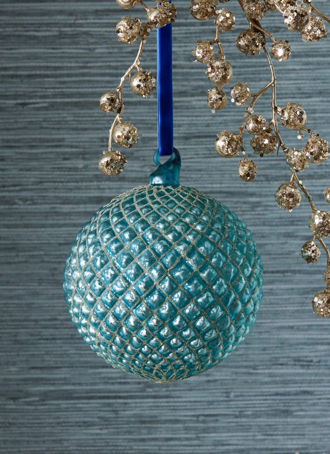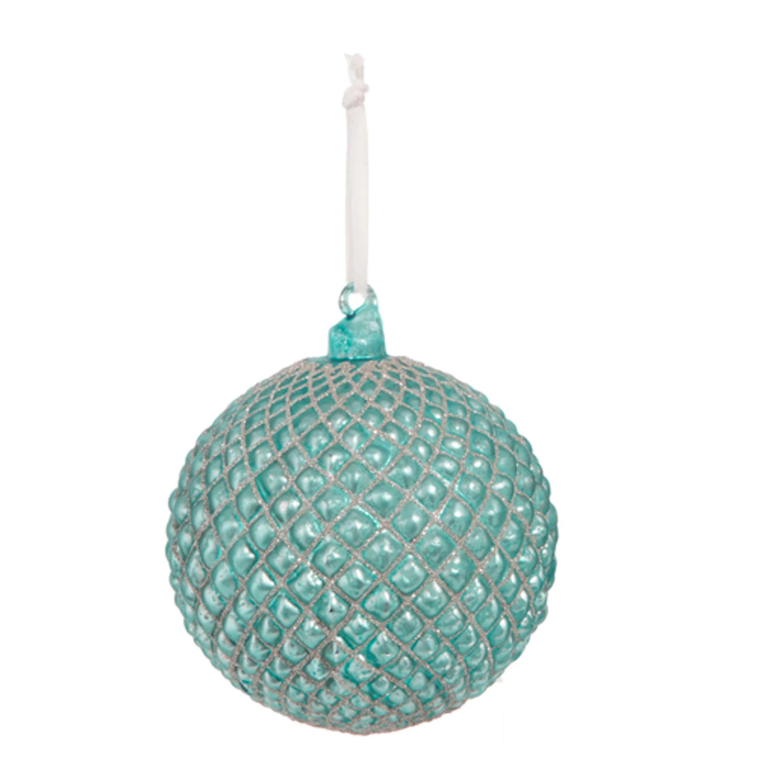 This stunning blue ornament features a unique quilted design with sparkling silver glitter in the grooves! Made by Raz Imports. Made of glass. Dimensions: 6″. Item #: 4322938