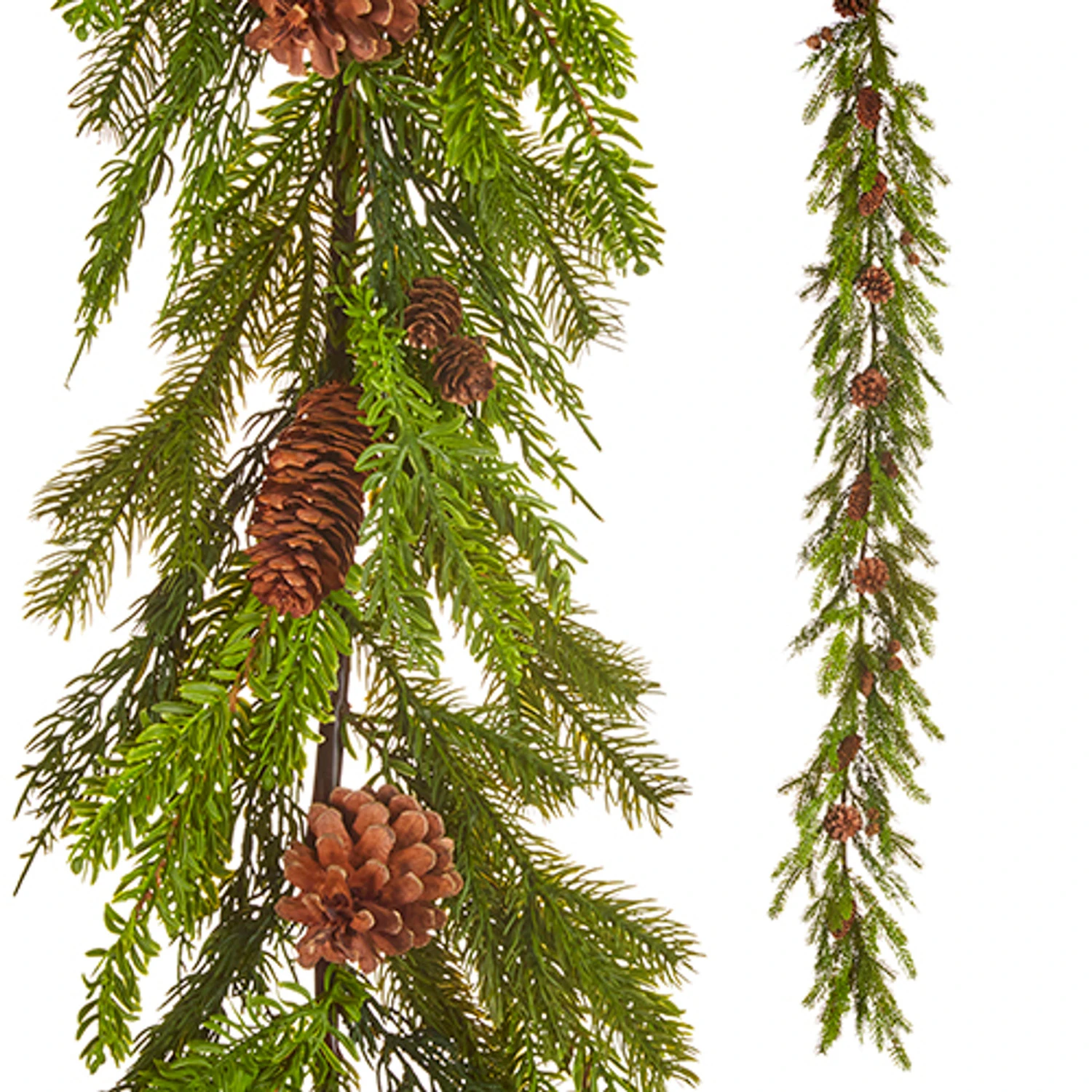 This garland features a realistic looking pine with small brown pinecones throughout! Perfect to hang along your mantle! Made by Raz Imports. Made of PVC and pinecone. Dimensions: 6′. Item #: G4212945