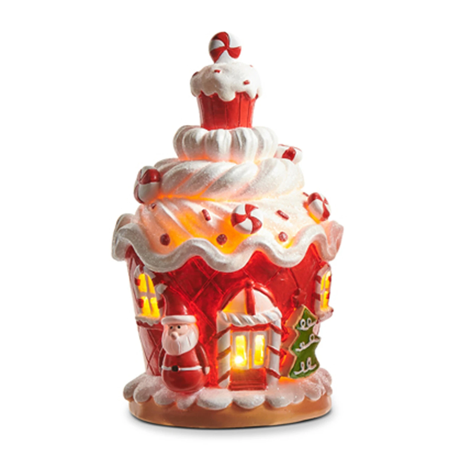 Sweeten up your mantle with these adorable gingerbread houses! Each one looks like a cupcake with a red wrapper and peppermint candy trimmed windows, a large dollop of white icing as the roof with cute little peppermint candy and cookie decorations! Choose the one with Santa standing outside of the door or a gingerbread man outside of the door! Requires 3 AA Batteries. 8 Hour Timer Repeats Every 16 Hours. Made by Raz Imports. Made of resin. Dimensions: 4.75″D X 7.75″H; 4.75″D X 7.5″H. Item #: 4311644