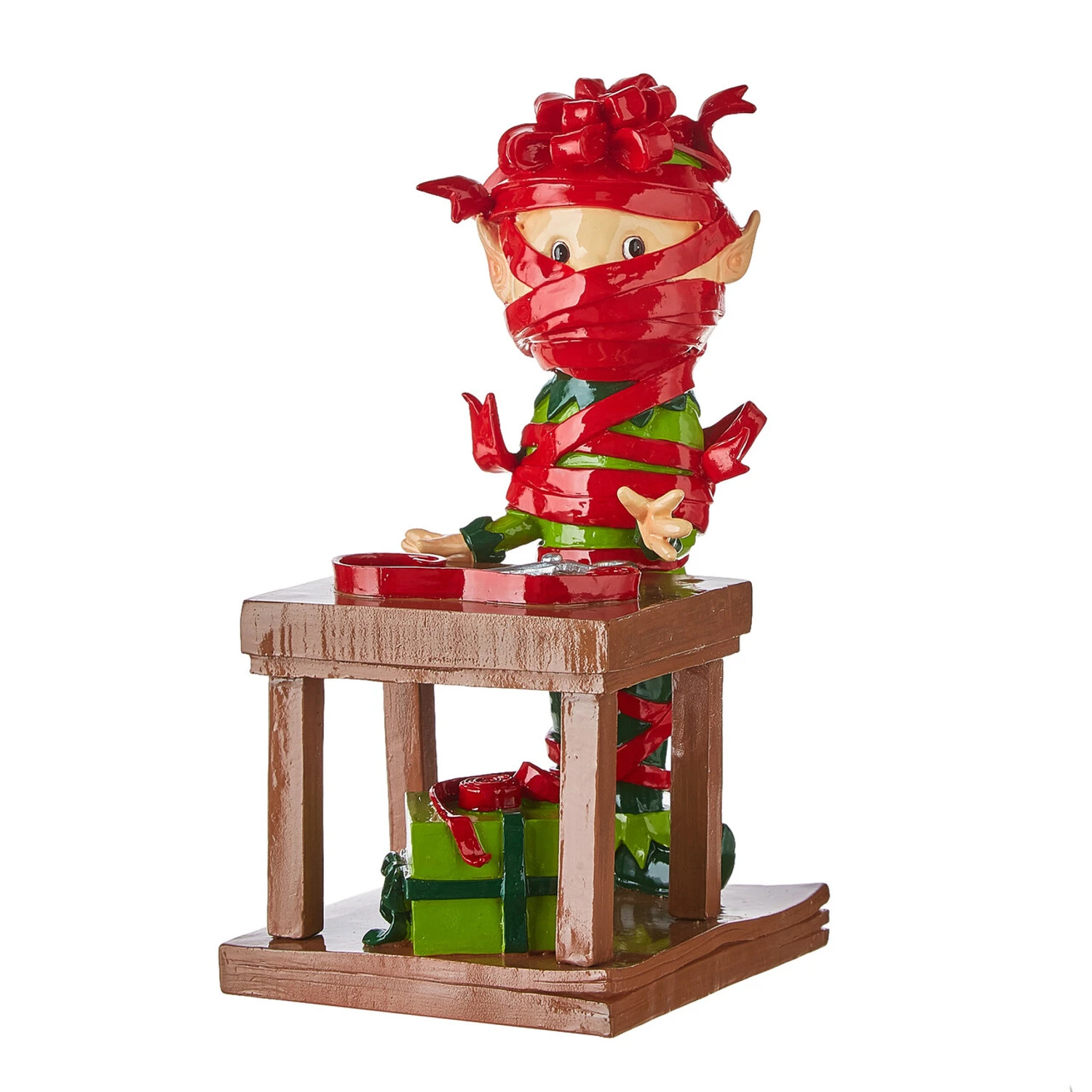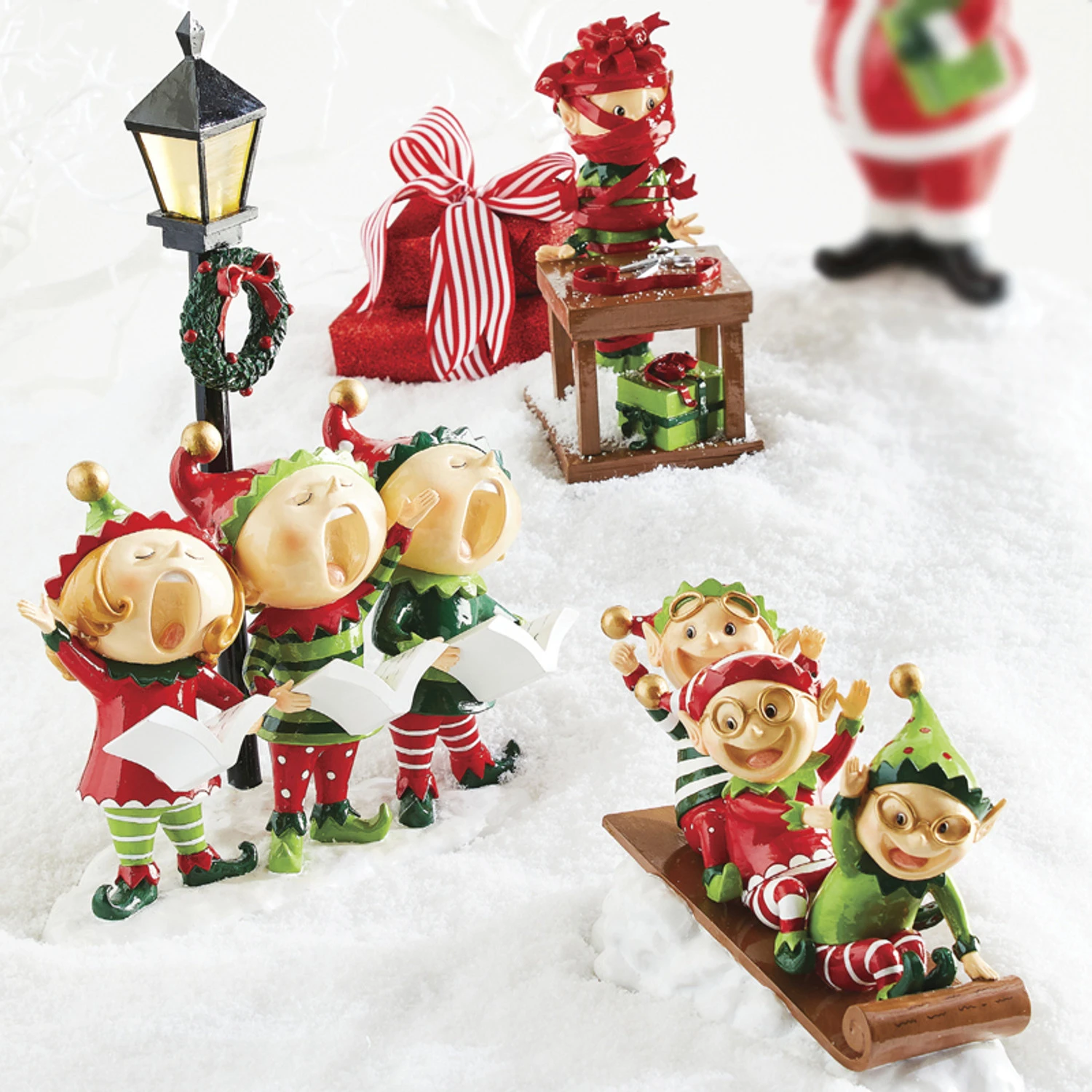 Today at the Elf University there’s a lot going on! One elf looks like he needs a bit more practice with wrapping gifts. He’s all wrapped up in bright red ribbon with a bow on his head- you can barely see his green elf outfit popping through the ribbon tangled around him! Another trio of elves excitedly slide down a snowy slope with giant smiles on their faces! And a few stand under a street light practicing their caroling skills. Each of these figures have bright red and green outfits sure to stand out in your decor this year! Each sold individually. Made by Raz Imports. Made of resin. Dimensions: 4″ L x 6″ W x 8.5″ H. Item #: 4110253 4110255 4110256