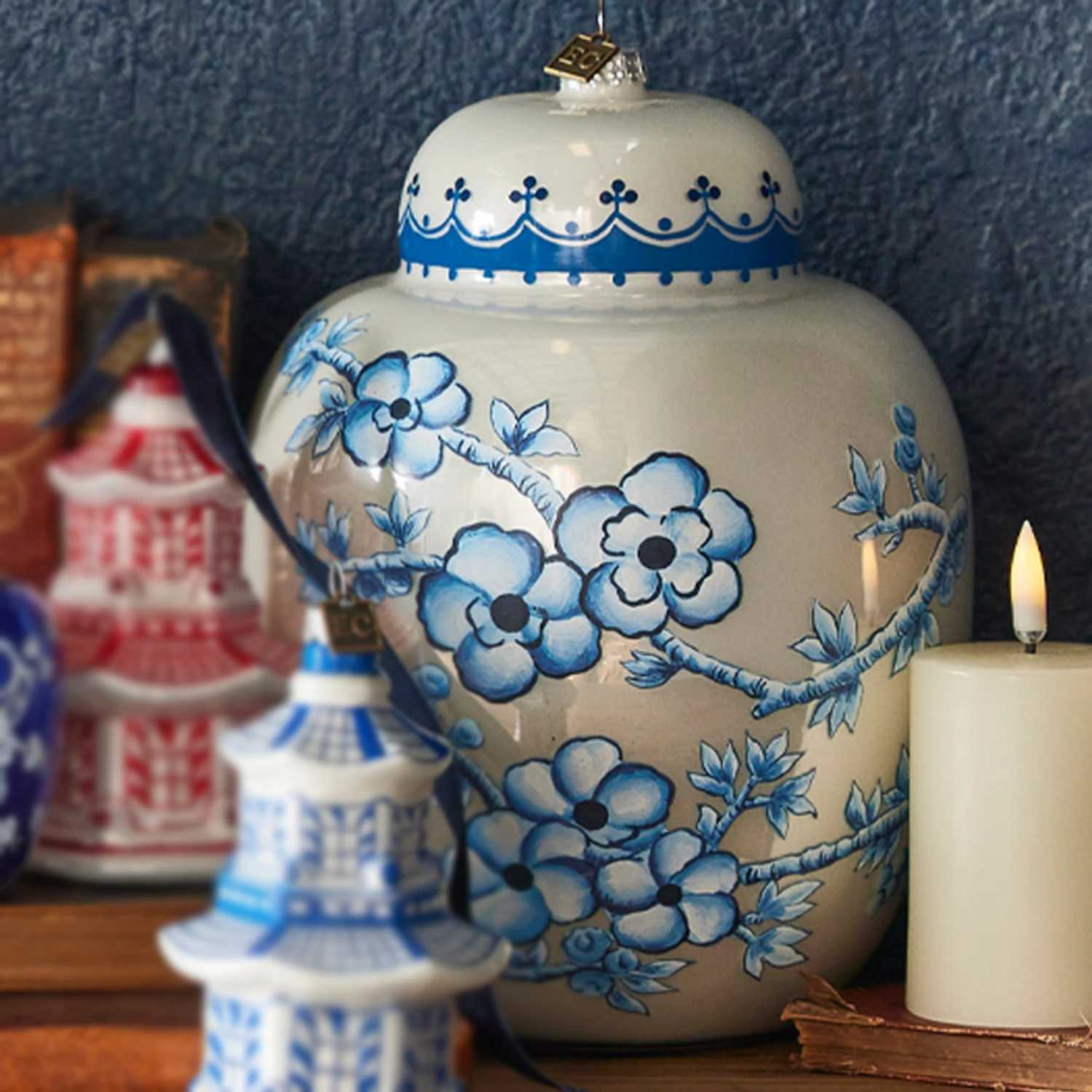 Stun your guests with this large and in charge Christmas ornament! It features a white glass vase decorated with blue cherry blossom branches and flowers and a a unique scallop design at the top! Made by Raz Imports. Made of glass. Dimensions: 6.25″ D X 8″ H. Item #: 4353144