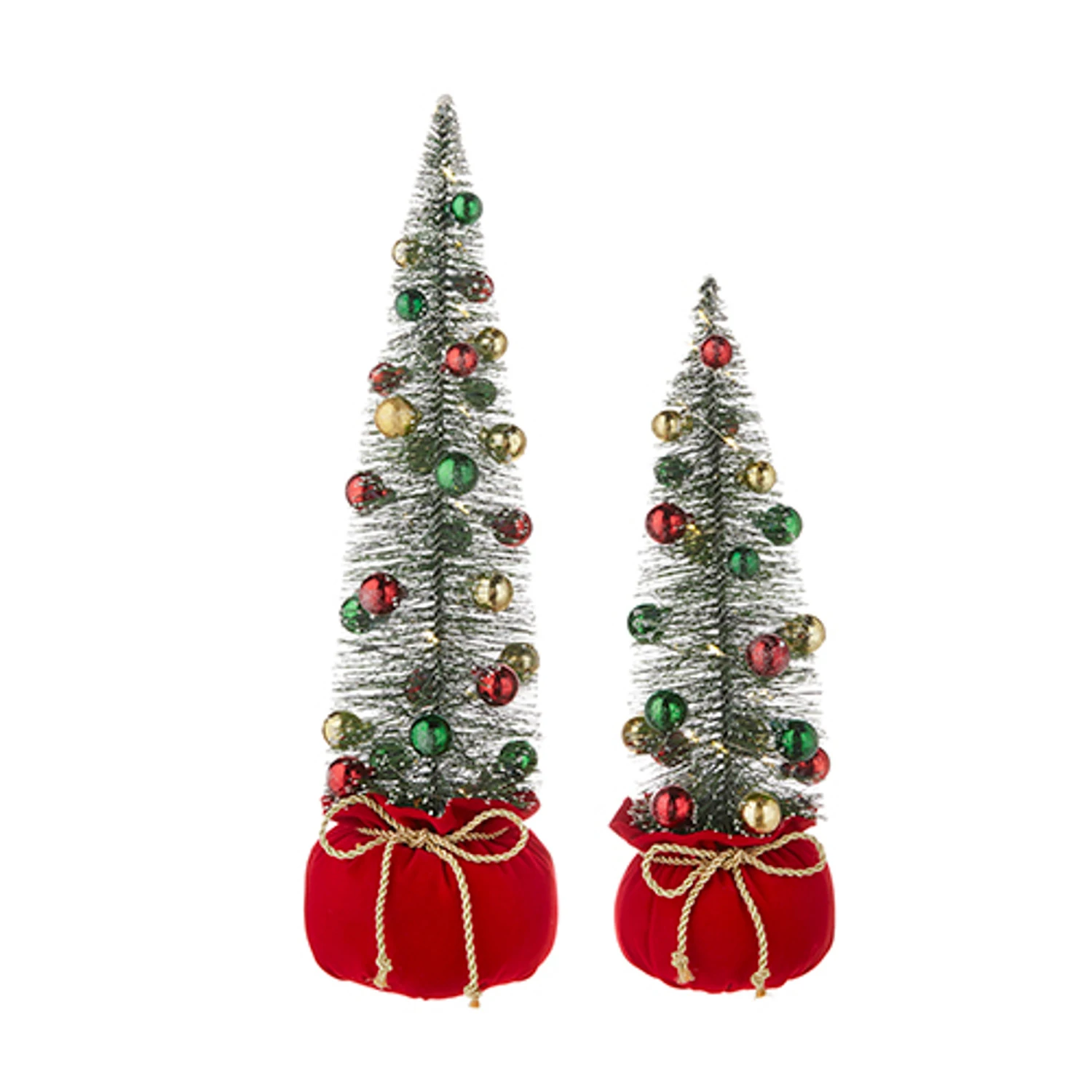 Looks like Santa left more than toys this year! Each of these pretty trees sit in a red velvet bag tied up with a gold rope! The trees are decorated with colorful ball ornaments and wrapped with tiny lights! Requires 1 Cr2032 Battery. 6 Hour Timer Repeats Every 18 Hours. Sold as a set of 2. Made by Raz Imports. Made of plastic and polyester. Dimensions: tallest tree is 20″ tall. Item #: 4215550