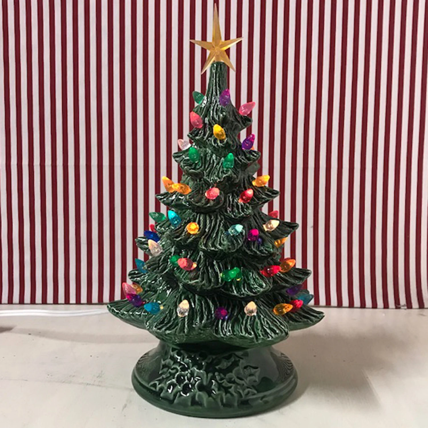 This lighted ceramic Christmas tree would look great on your table top, on a mantel or even in a guest room to bring Christmas cheer. Hand made by local artisans, this little tree is made from the original molds from the 1940’s. Includes: tree, base, interior light bulb, and Christmas color light bulbs. Dimensions: 12″ tall (with star) 10″ (without) and 8″ wide.