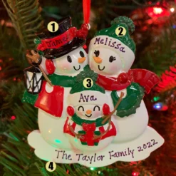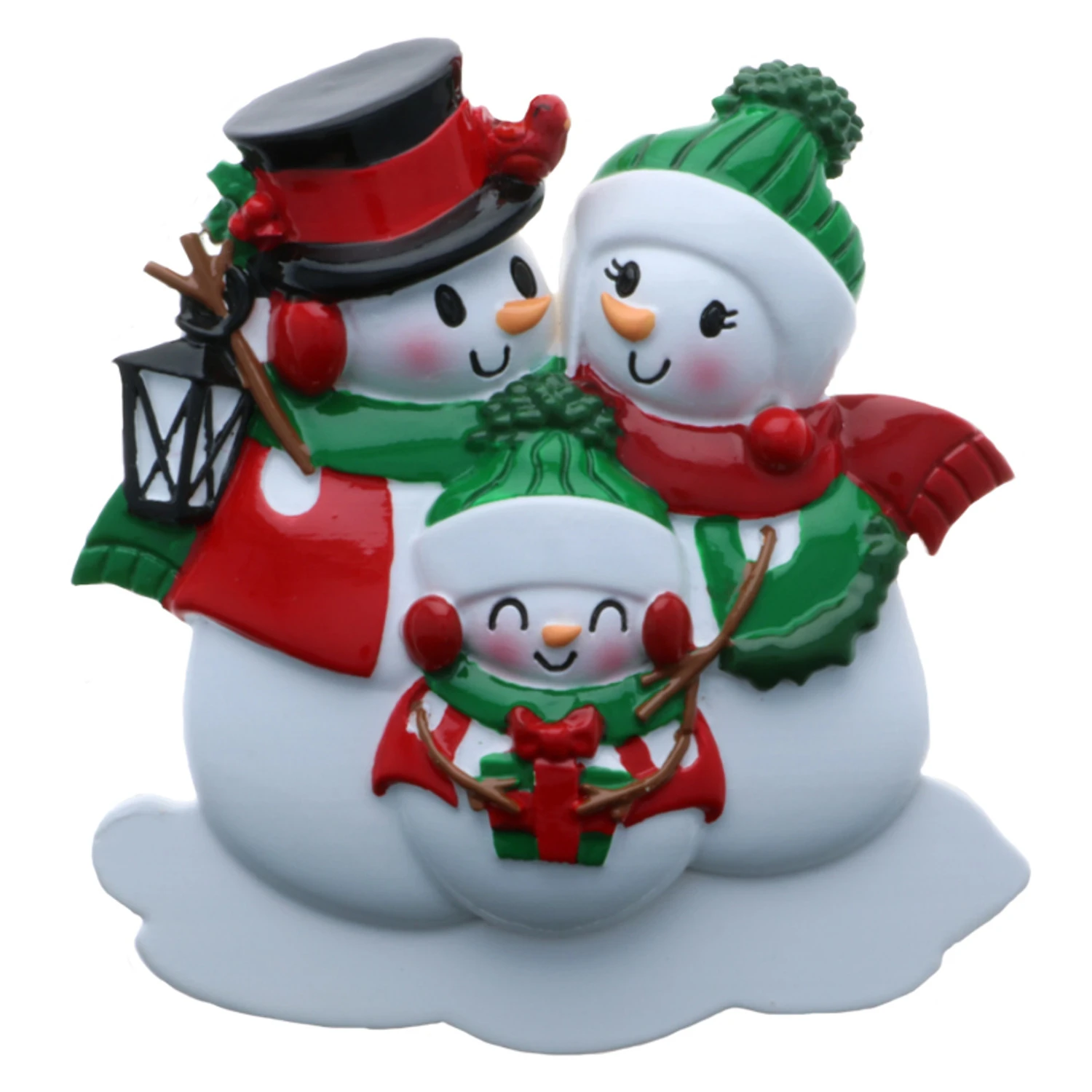 This little family is wearing coordinating red and green Christmas outfits and ready to attend their Christmas party! Get you, your significant others, and your littles names on each hat and the year written at the bottom. Made of resin. Item #: OR2255-3