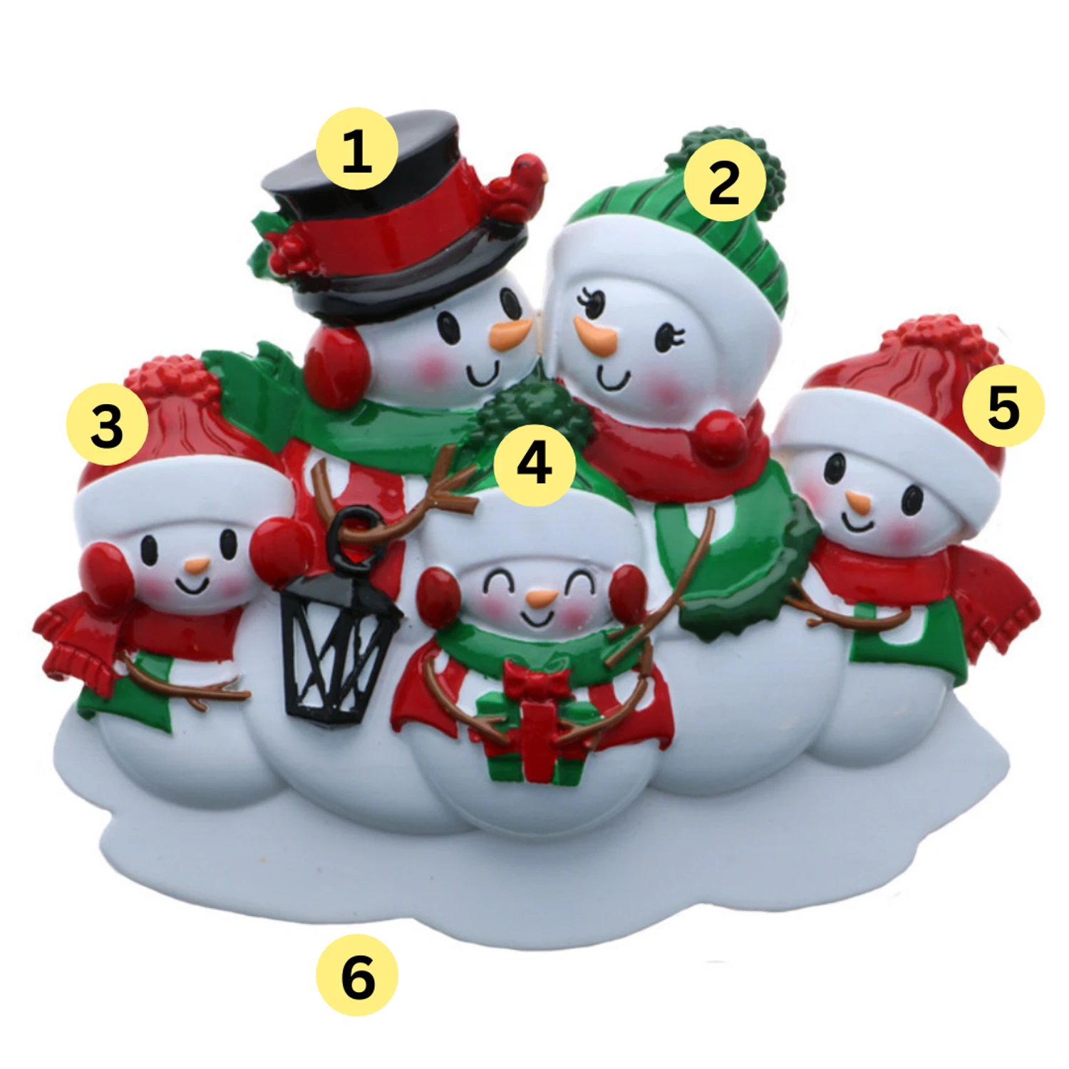 Get a cute as can be keepsake for Christmas this year! This ornament features a family of 5 snowmen wearing green and red outfits and smiling faces underneath warm hats! Get each name written on the hats and the date at the bottom! Made of resin. Item #: OR2255-5