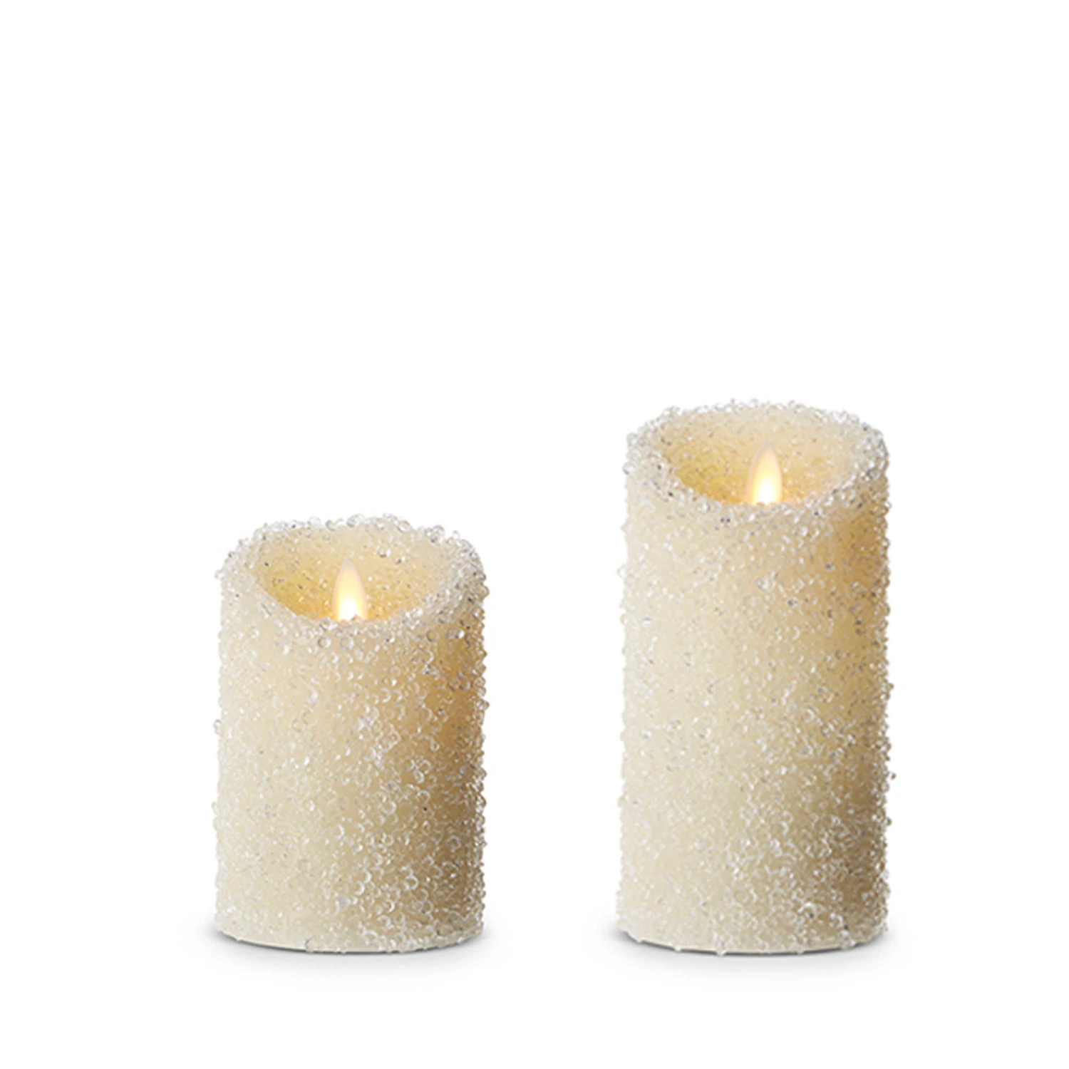 Decorate your home with these stunning candles! Each one is encrusted in tiny clear ice crystals as the moving flame flickers above tossing little shimmers of light that resembles real candle light! Requires 2 C Batteries. 5 Hour Timer Repeats Every 19 Hours. Battery Life Approx 500 Hours. Remote Ready. Can Be Used With Remote #15997 and #38017. Made by Raz Imports. Made of wax and plastic. Dimensions: 3″ x 5″ or 3″ x 6″. Item #: 43041 or 43040